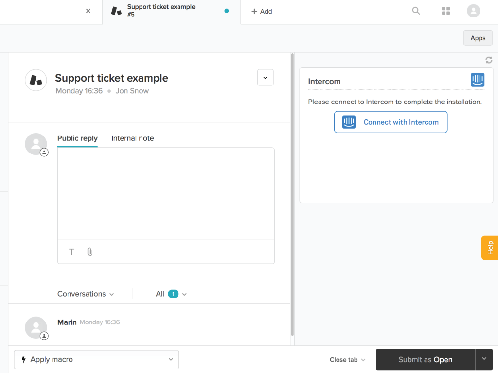 Navigate to a ticket and click on Apps You will see the Intercom panel on the right hand side. Click the Connect to Intercom button and authorize your account.