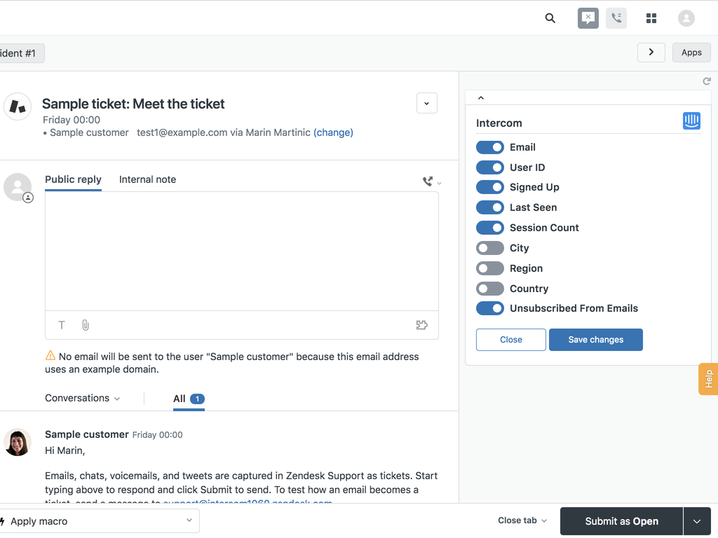 Integrating Intercom with Zendesk ensures you have all the context you need to solve support issues quickly, with live customer data from Intercom right inside Zendesk. You can customize exactly what you want to see, including account and usage data, as well as sync user tags back into Intercom.