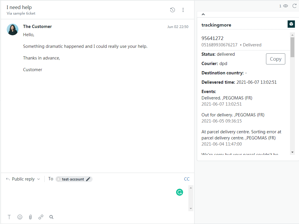 Trackingmore app for Zendesk will display the associated shipments of the customer at the ticket view, including the following tracking information.