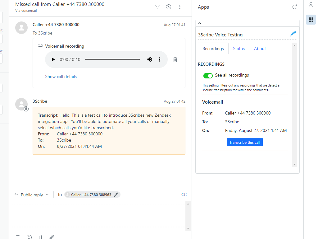 3Scribe's Zendesk integration allows you to convert your voicemail, inbound and outbound audio calls into a readable note using the world's most accurate transcription engine.