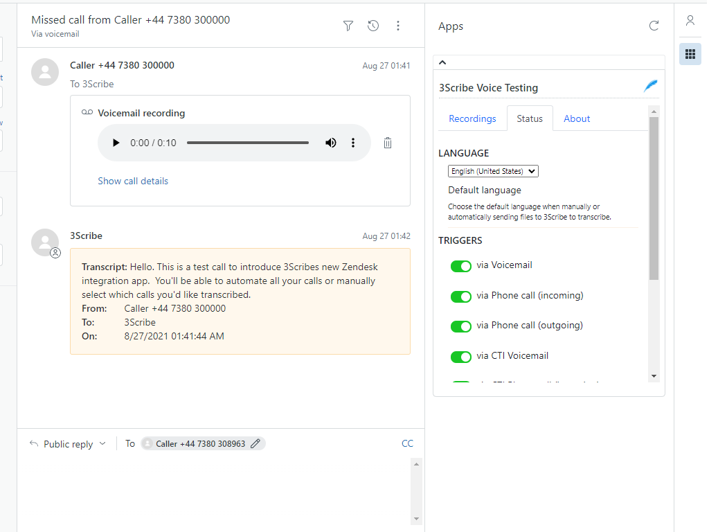 Supporting 11 different languages and dialects, you can have your calls automatically transcribed once they're completed or you can manually select which calls you'd like to process via the ticket sidebar.