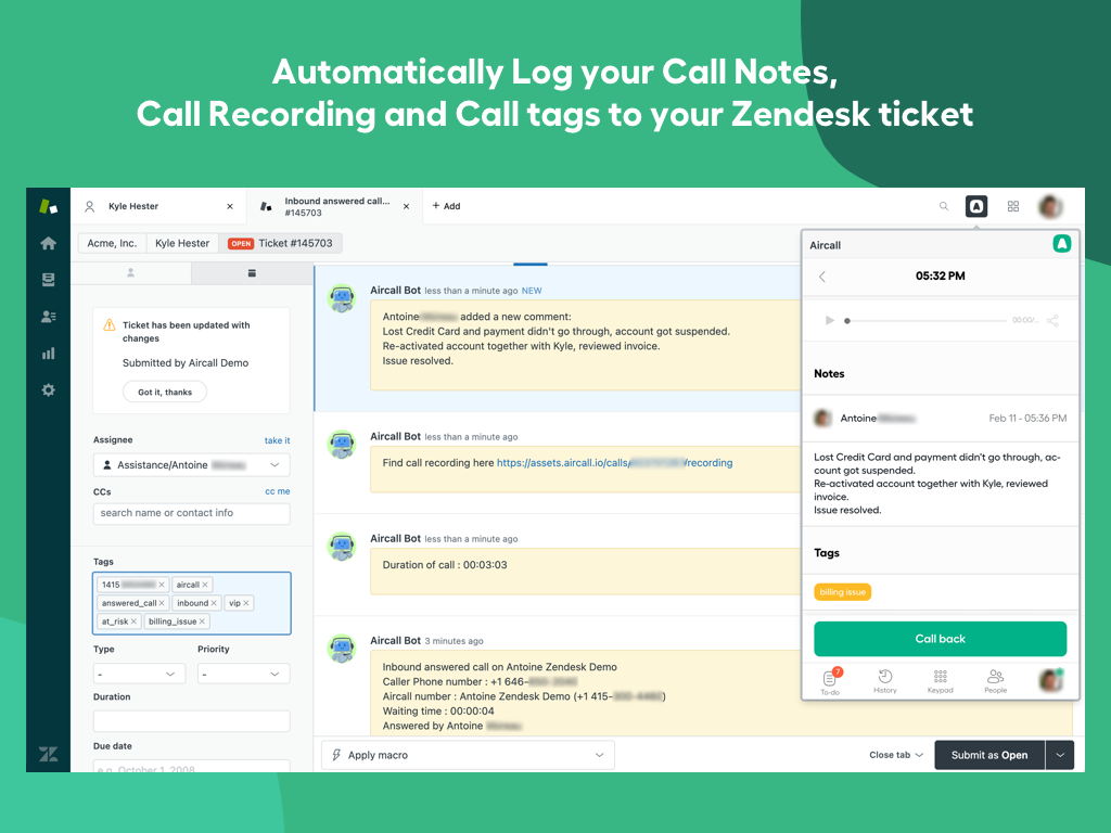 - 100+ integrations: integrate Aircall with Zendesk as well as all of your business tools with plug-and-play integrations with Slack, Shopify, Gong, Textline, Typeform, and many more! Take a look at our marketplace!