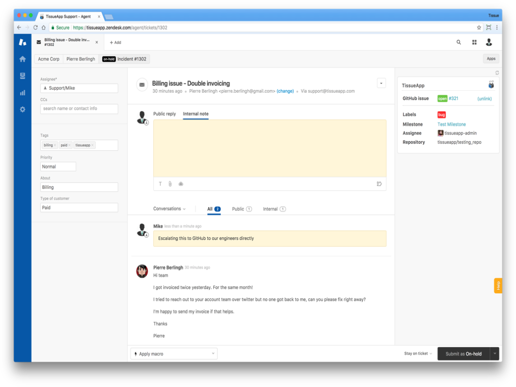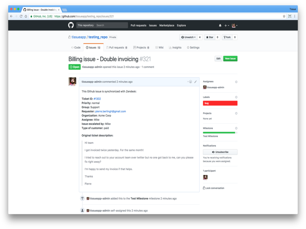 - Collaborate Seamlessly: Your support staff stays in Zendesk, logging customer issues and updates. Your developers remain in GitHub, working on issues and pull requests. TissueApp ensures both platforms are always up to date.
