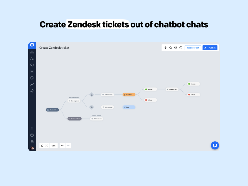 Let customers raise Zendesk tickets while chatting with a chatbotThe direct ChatBot integration for Zendesk allows you to create tickets out of chatbot conversations. By connecting both apps you can personalize your ticket communication.