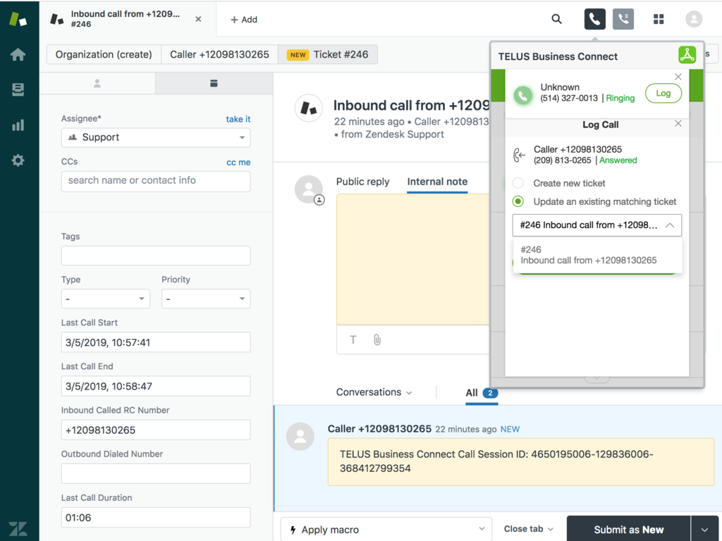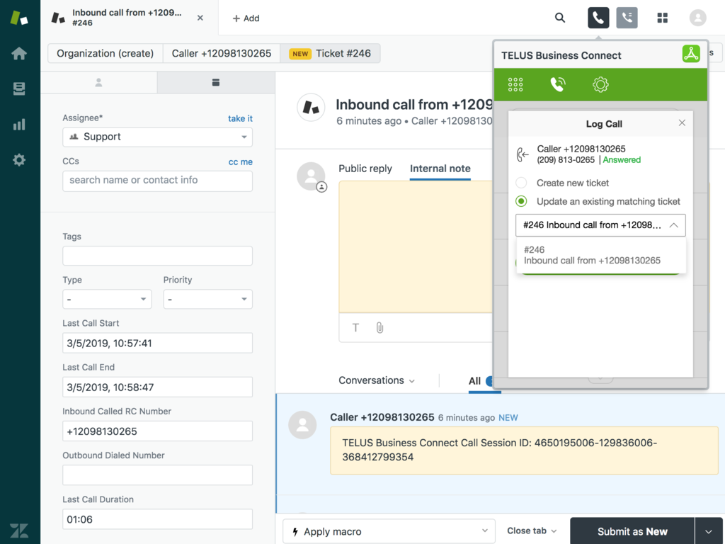 Make or receive calls through the Zendesk browser without having to leave Zendesk or utilizing the TELUS Business Connect phone system all directly from your account within Zendesk.