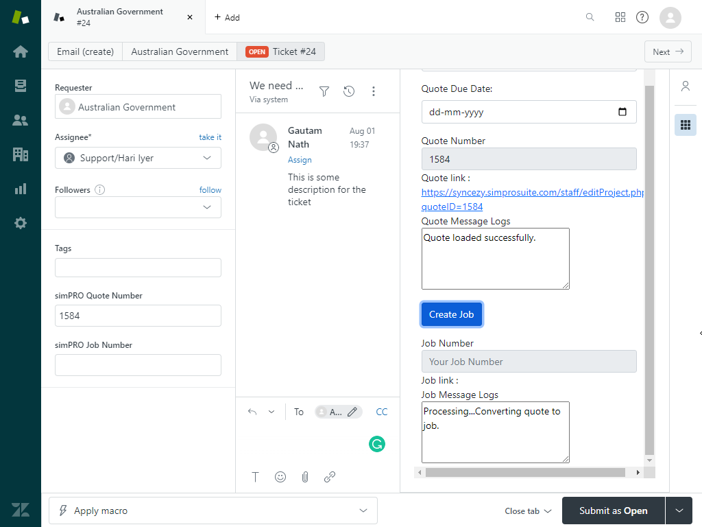 This app is used to send ticket information from your Zendesk account to simPRO quickly - to Quotes or Jobs.