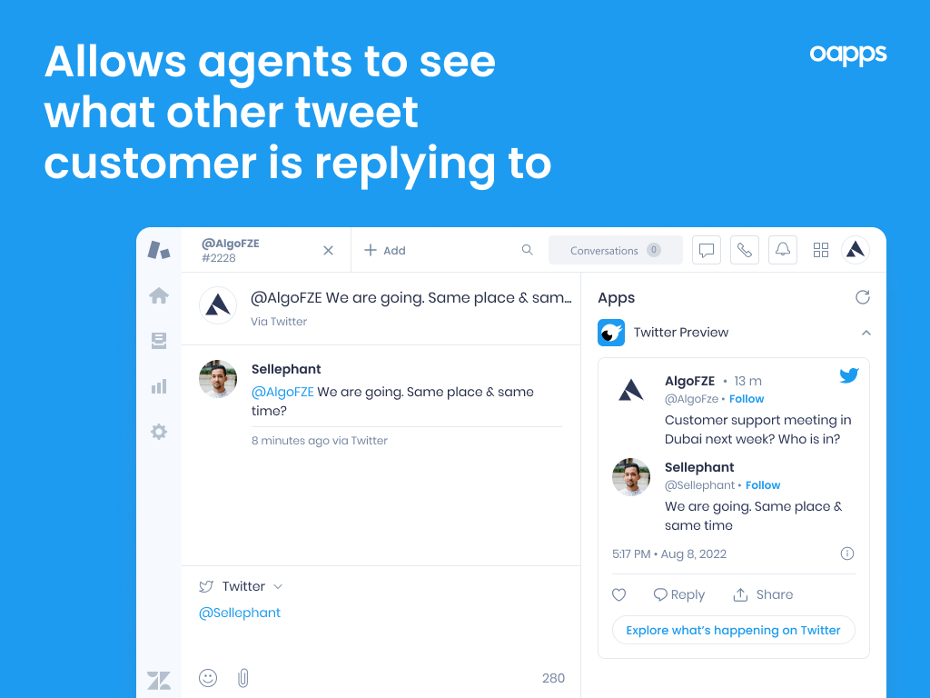 The app allows your agents to be more productive by better understanding the context of the Twitter conversation.With this app, they can: