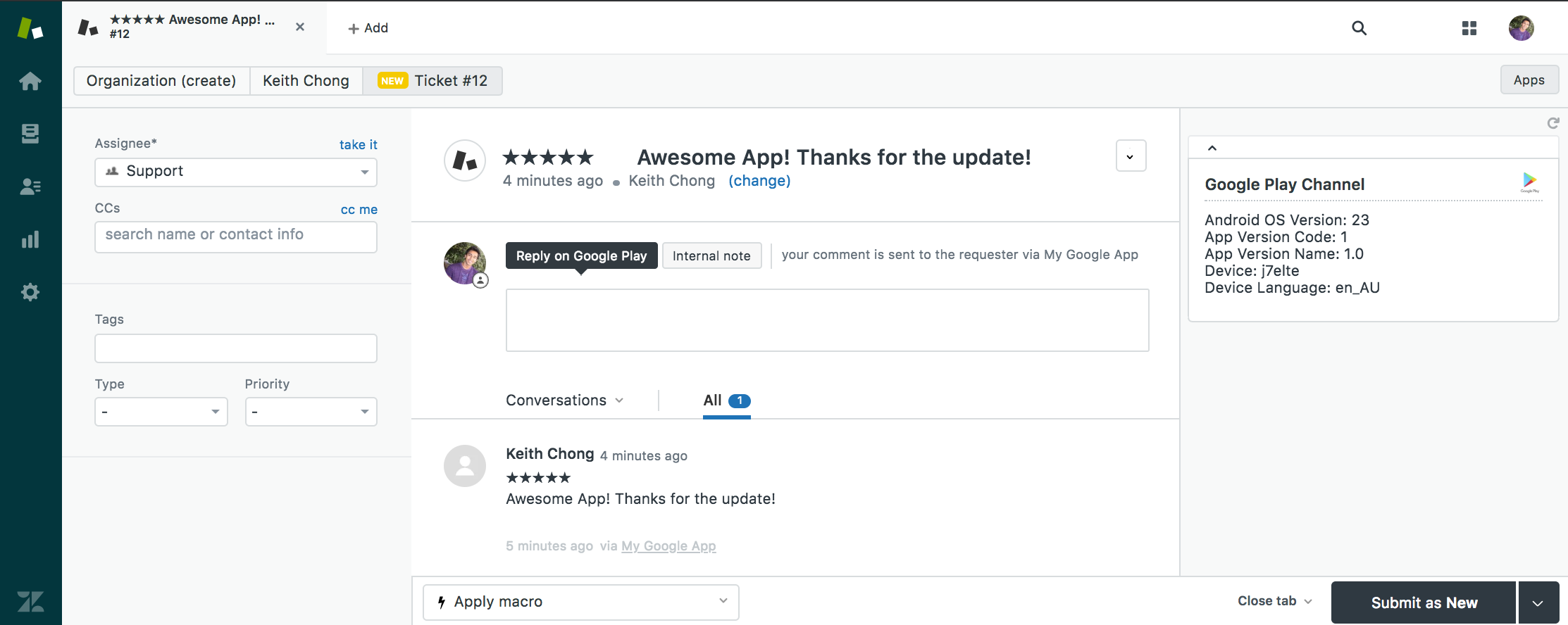 We’ve made it easy to receive and reply to user reviews of your Google Play app or game directly inside Zendesk Support, an environment built to scale customer engagement. By replying to reviews, you can directly engage your users to understand their feedback. Prospective users might also be more likely to install your app, if they see that you are engaged and responsive.