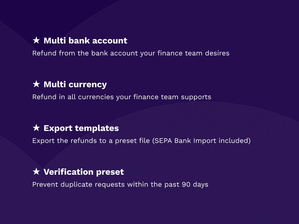 Refund request let’s agents make a refund request on behalf of a customer. Ask a refund thru bank transfer, when you’re no longer able to do a refund via your PSP (Adyen, Paypal, Creditcard or other).