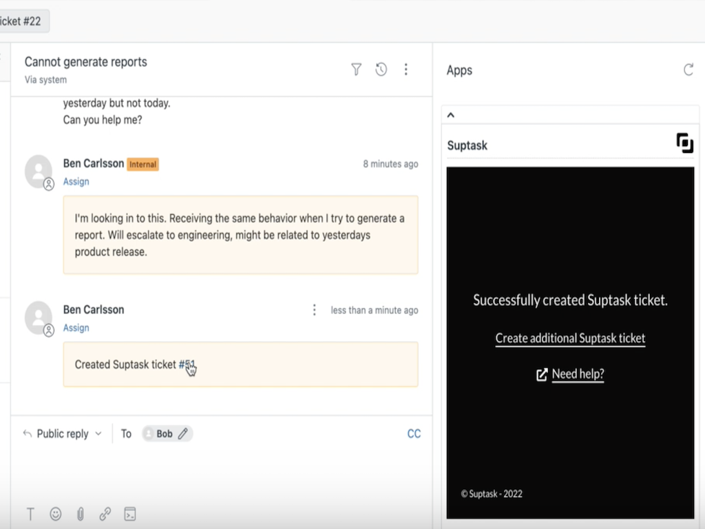 Suptask integration with Zendesk allows you to easily escalate and create related tickets from Zendesk directly to any team using Suptask in Slack.