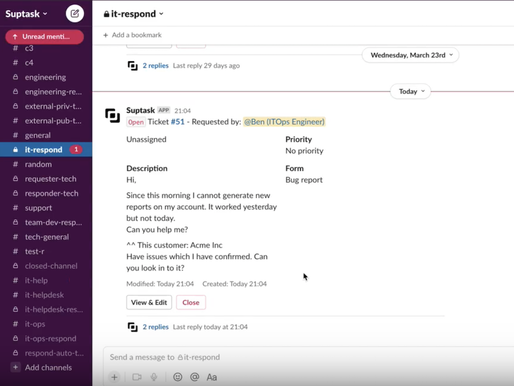 Create: Users in your Slack workspace can submit and track tickets without leaving your Slack workspace.
