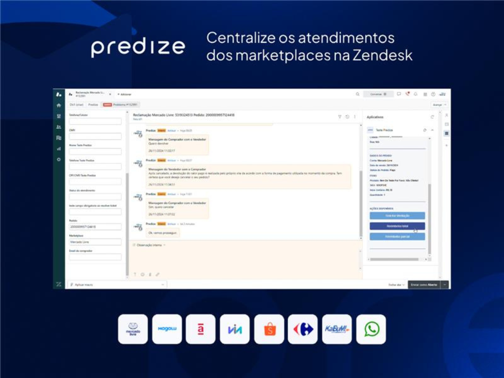 Centralize os tickets na Zendesk automaticamente: Suas mensagens, perguntas e reclamações de 7 marketplaces chegam organizadas, com detalhes completos dos pedidos e publicações. Marketplaces integrados: Mercado Livre, Shopee, Magalu, Americanas, Carrefour, Amazon e Via.