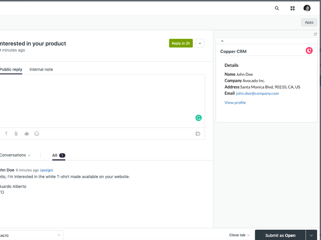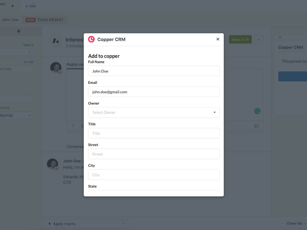 The Copper by Fifty4 integration lets you view and add people to your Copper account, making it easy for sales reps to manage your CRM from the Zendesk Support ticket page.