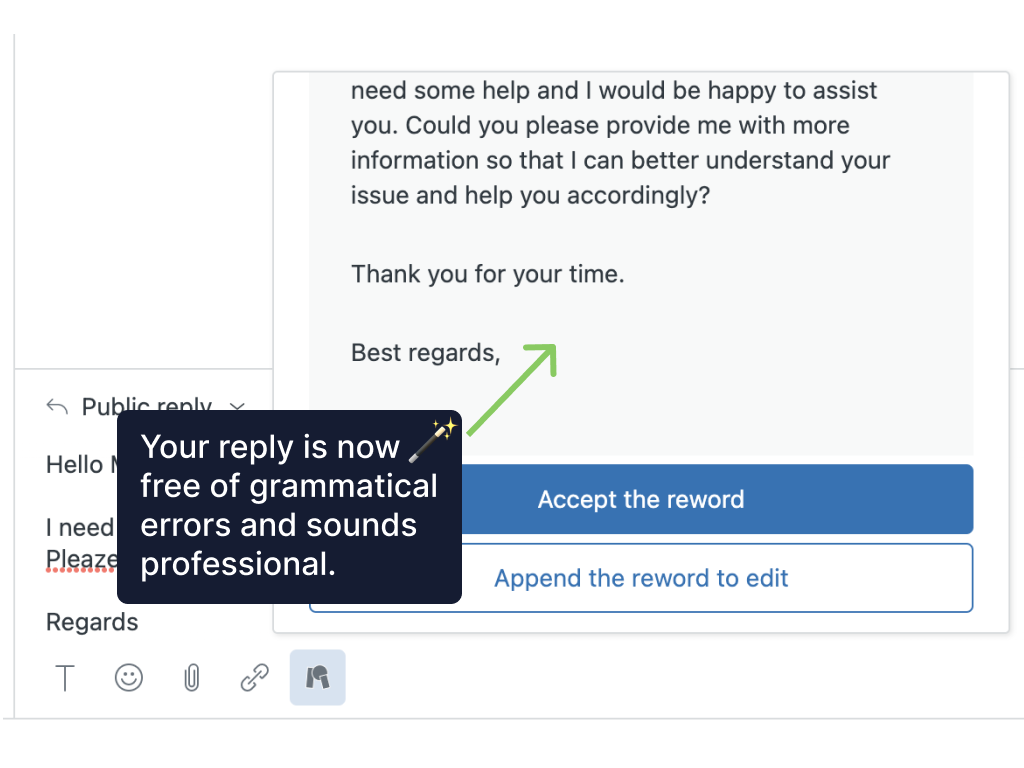 Stop feeling uneasy when you open support tickets from your agents! All of their tickets, even those redacted without macro, will be perfectly written and polite.