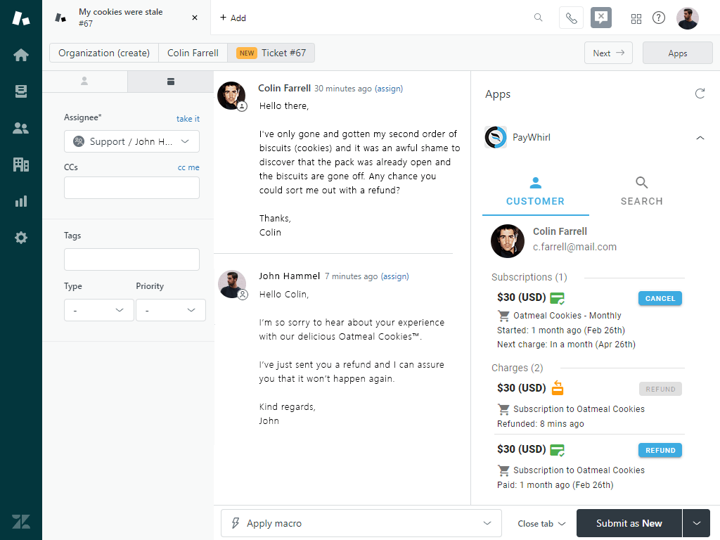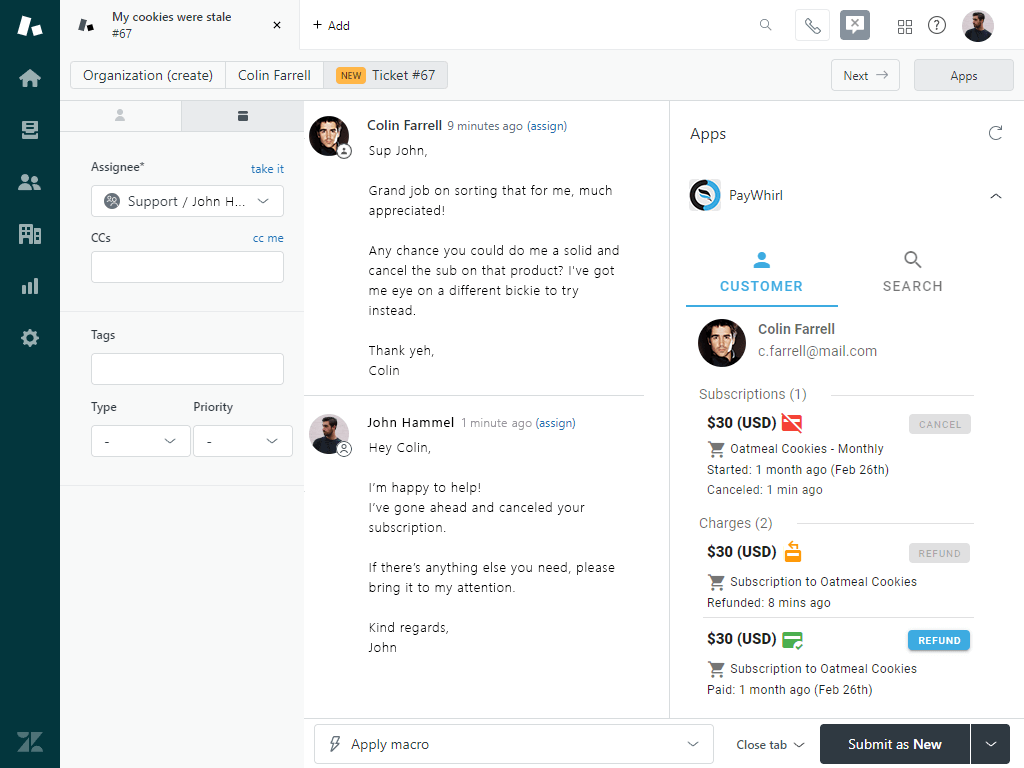 Keep all your customer payments and subscriptions working smoothly with PayWhirl Connect in Zendesk Support. You'll have an easy view of customers and their invoices, and be able to refund and cancel subs hassle-free. Our slick algorithm hooks up payment data with the right support tickets pronto, so you can solve issues lickety-split. So long to tedious payment management, and welcome to speedy support ticket fixing.