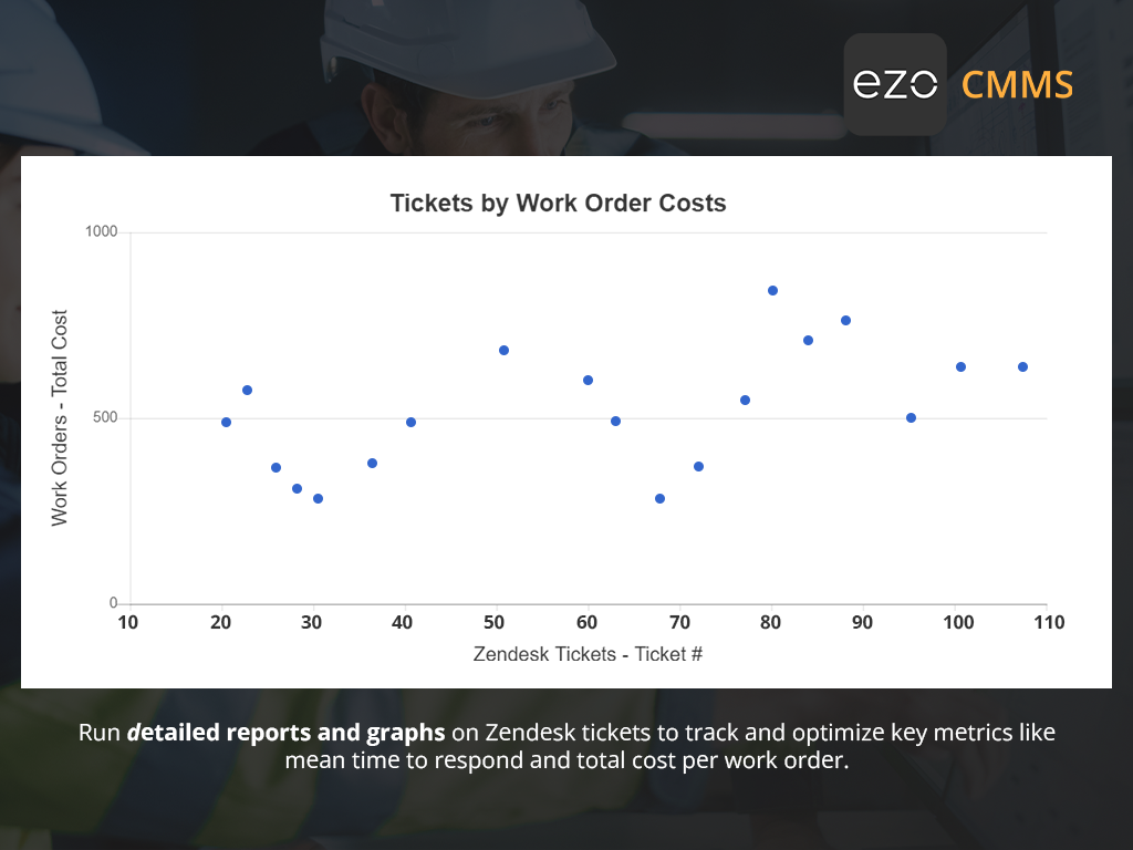 An engineering company pulls a report in EZO CMMS showing all of the Zendesk tickets associated with their equipment, identifies malfunctioning items, and submits return merchandise authorizations before the warranties expire, reducing the volume of service tickets.