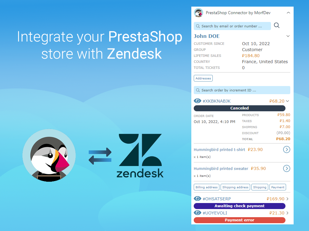 The PrestaShop Connector for Zendesk Support and Chat will allow you to connect your PrestaShop stores and display customer information on the Zendesk side.