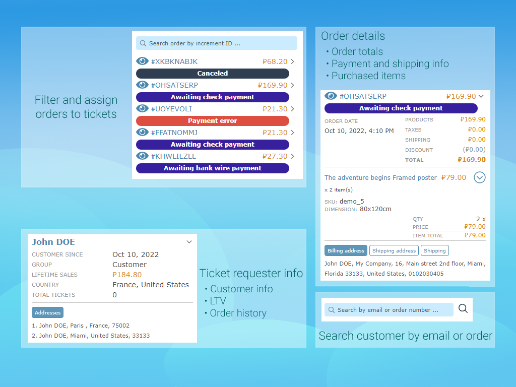 The application by default uses the ticket requester email for searching and looks for information on the PrestaShop store. Found information is divided into detailed data about the customer and all orders associated with this customer. In addition, the application can connect several PrestaShop stores at the same time and display information for each store.