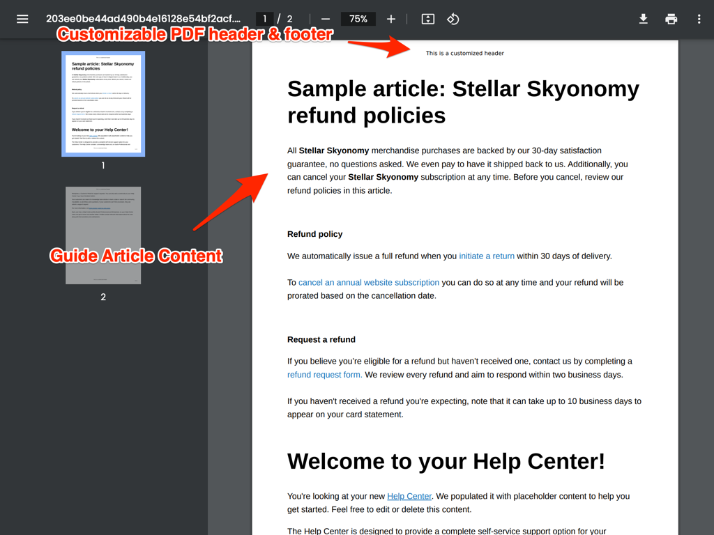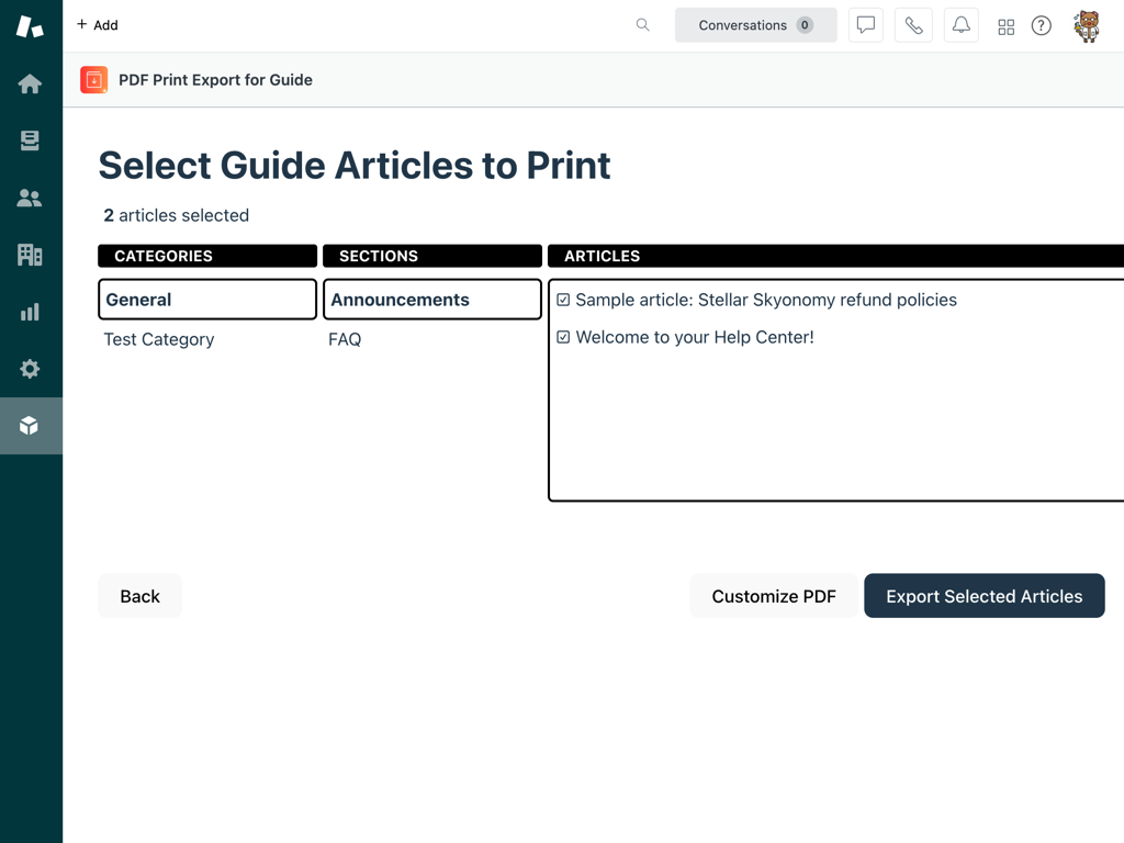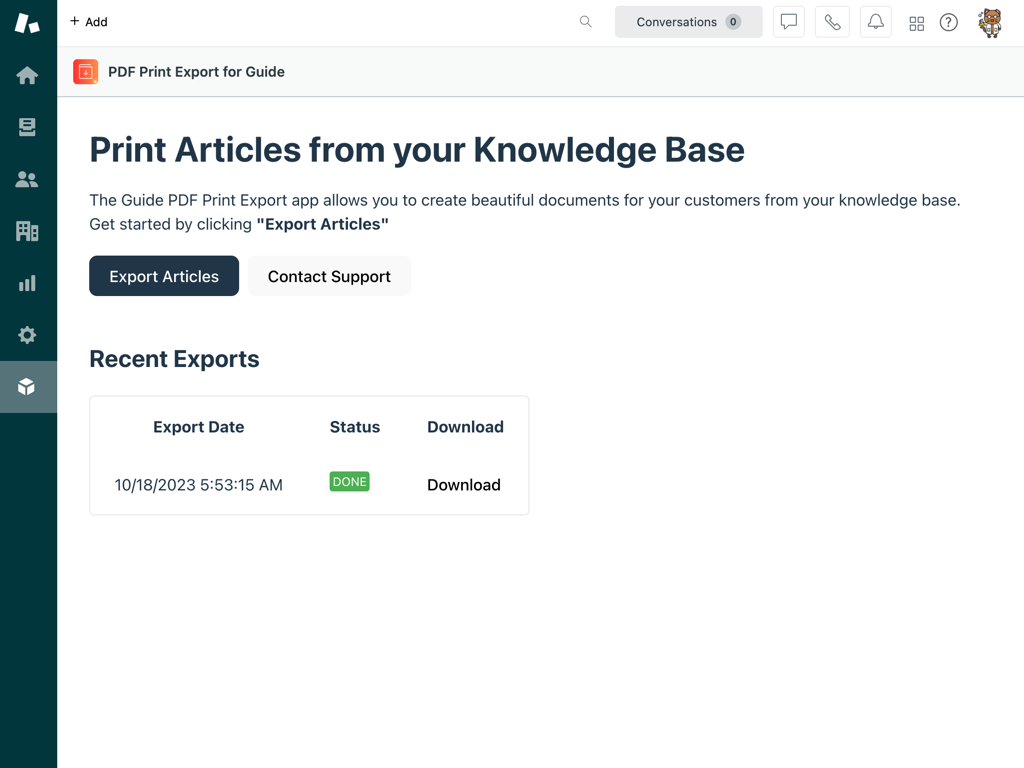 PDF Print Export for Guide allows your agents to easily create beautiful print-ready PDFs based on your knowledge base articles with only a few clicks.