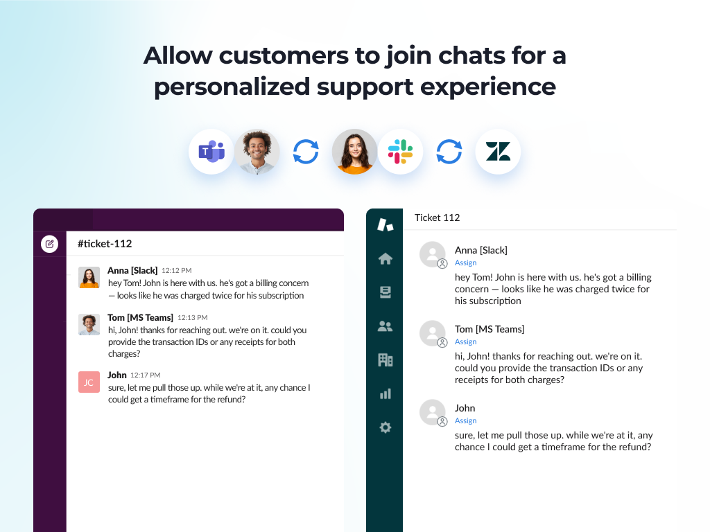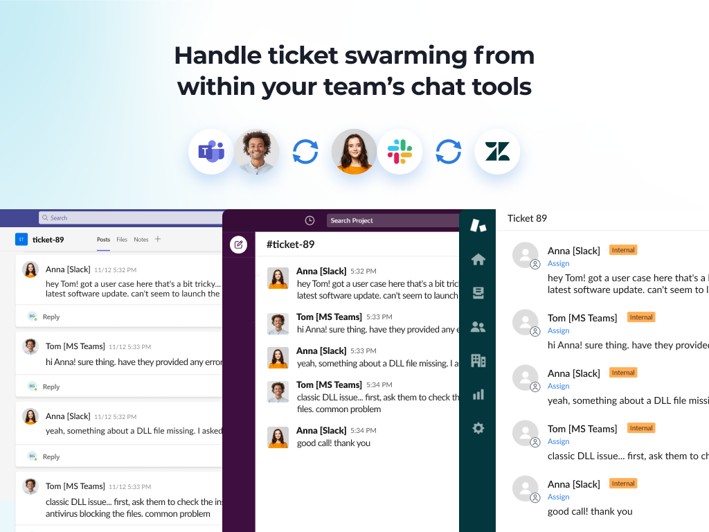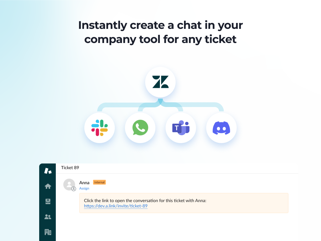 Allow your team to communicate using the best-performing chat tool for their workflow, be it Slack, Microsoft Teams, Discord, Text Message, or WhatsApp, while keeping all communications centralized and compliant within the original Zendesk ticket.