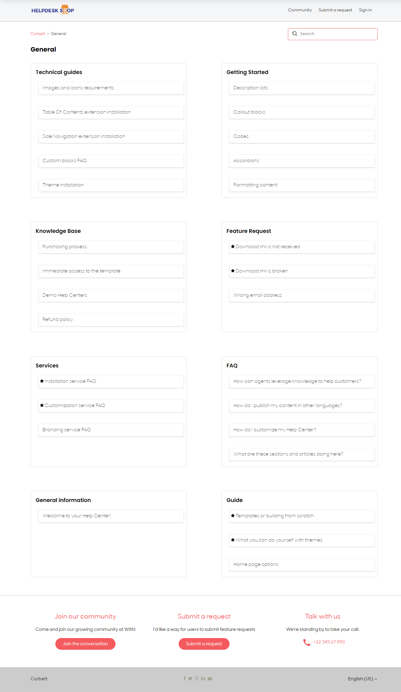 Corbett is a fully responsive multipurpose Zendesk Help Center (Guide) theme. The theme is a perfect balance between style and performance. All the elements of the help center are arranged in a way that keeps navigation super easy. The theme comes with an attractive black background at the back of a floating search box at the center of it all. It has a stunning full-screen layout with beautiful blocks and interactive design elements, which generate an airy and elegant feeling in the help center.This theme has multiple boxes, which are sections. It makes navigation very easy in the theme. Your sections are displayed on the home page and all the articles can be seen by clicking on the section boxes.Note:- The best way to use this feature is to make one single Category and put all the sections inside it. However, this theme only allows a maximum of twelve sections.It follows the latest trends in web design and features a brand new layout with a long list of features.