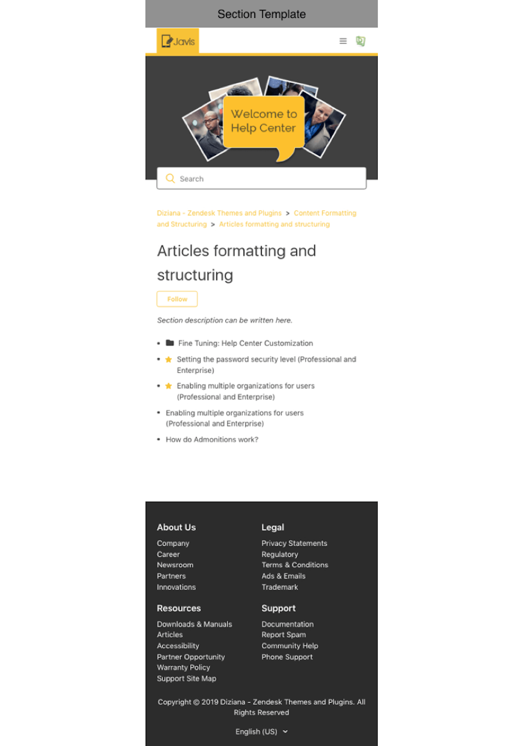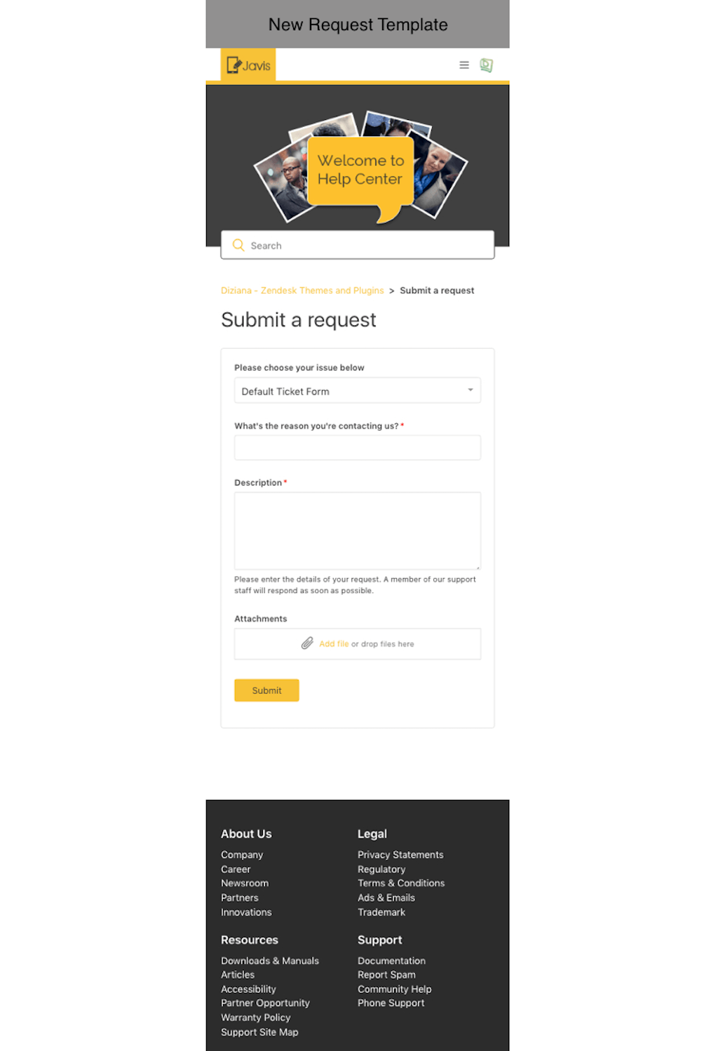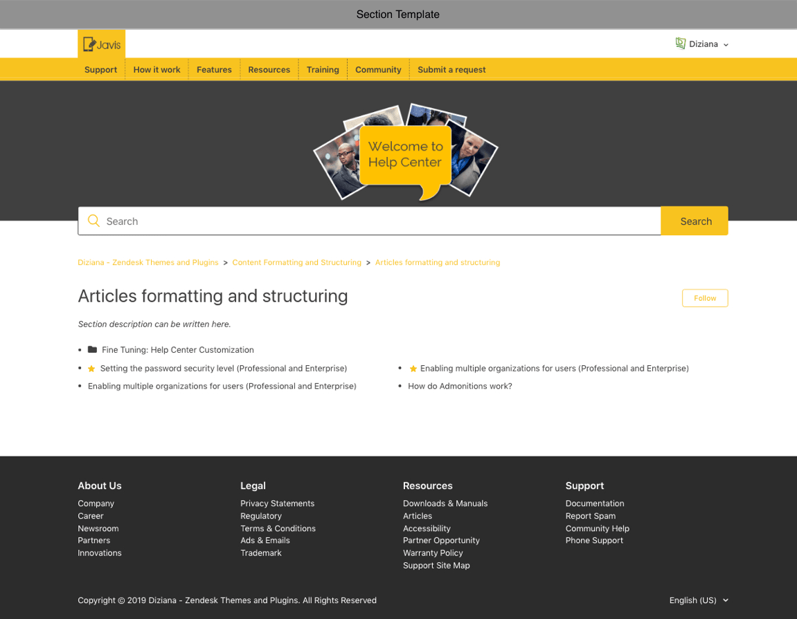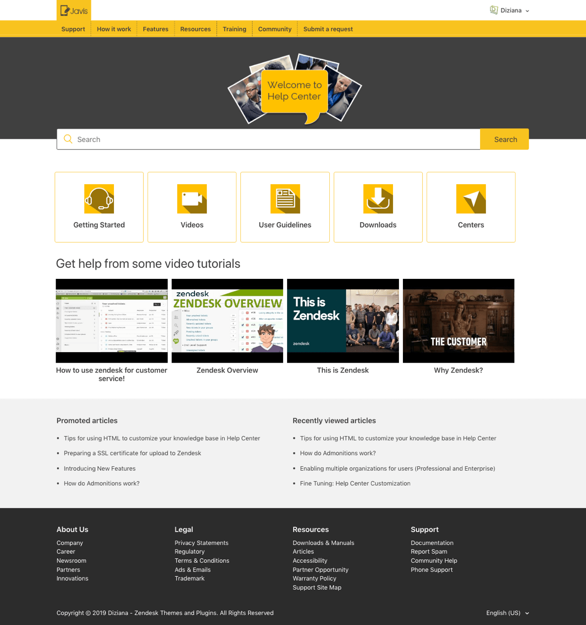 Diziana Javis is a fully responsive Zendesk® Guide Help Center Theme (templates). It can be used by all kinds of organizations -- Technology, Education, tours & travel, Food, Startups, IT, Medical, Construction, Builder, Marketing, Startup, Fashion, Government, NGO, Not-For-Profit - Companies, Business, or Organizations.
