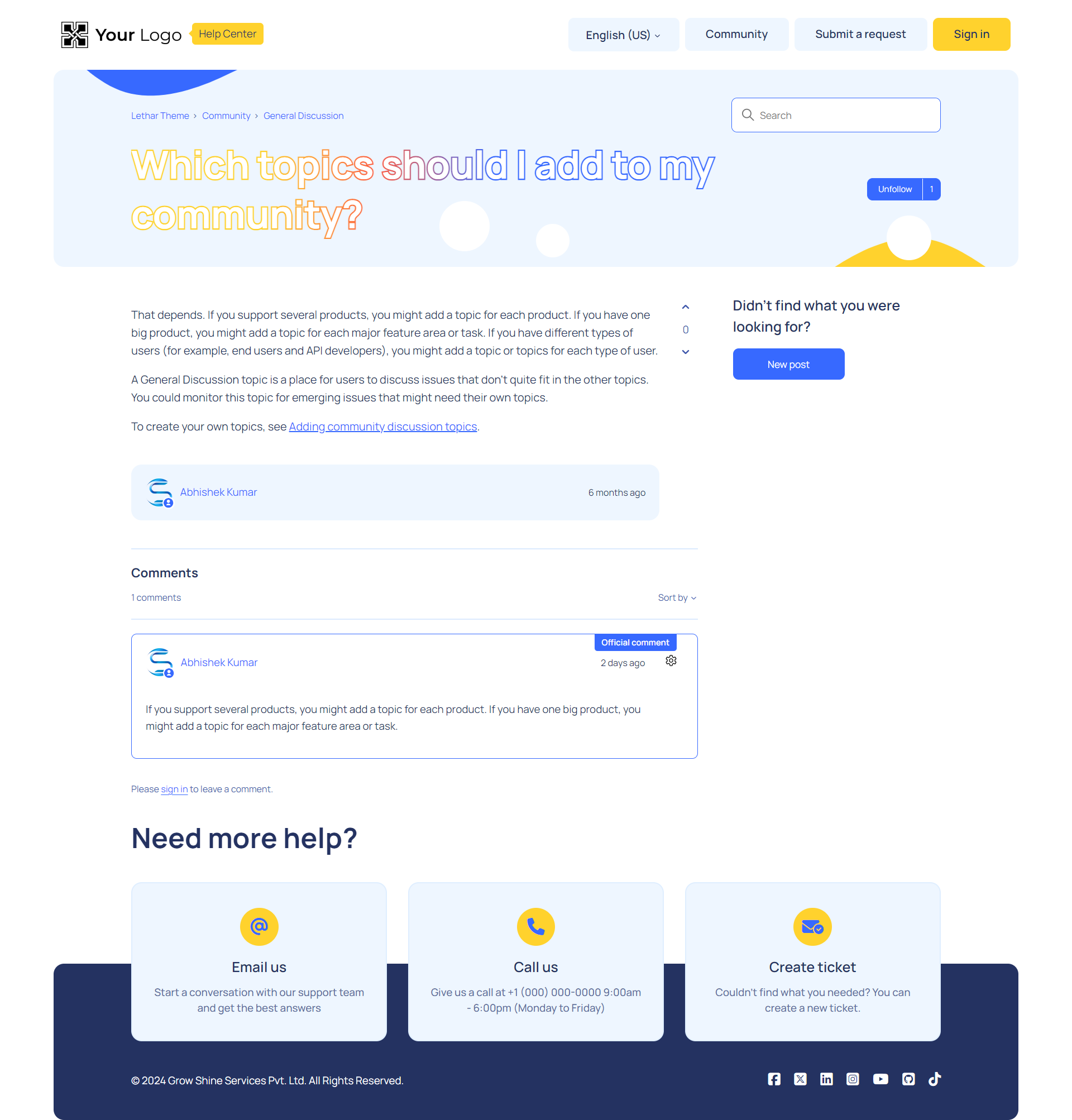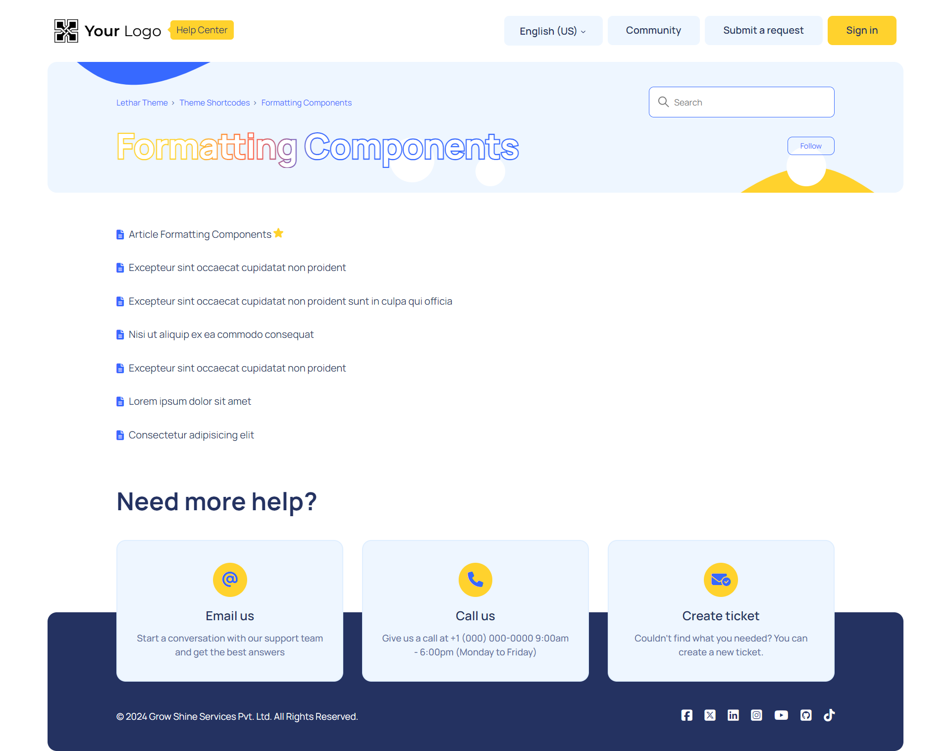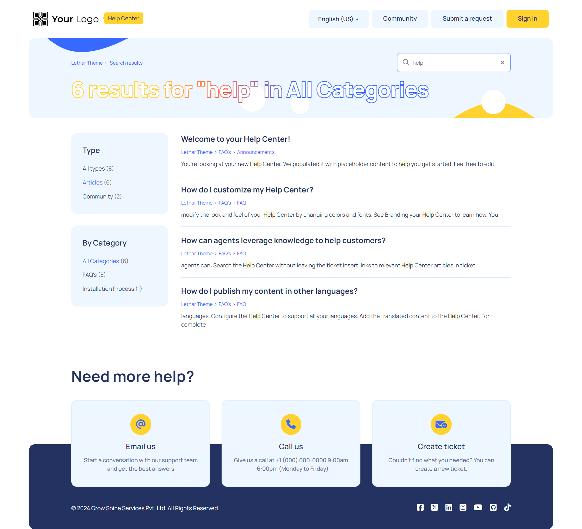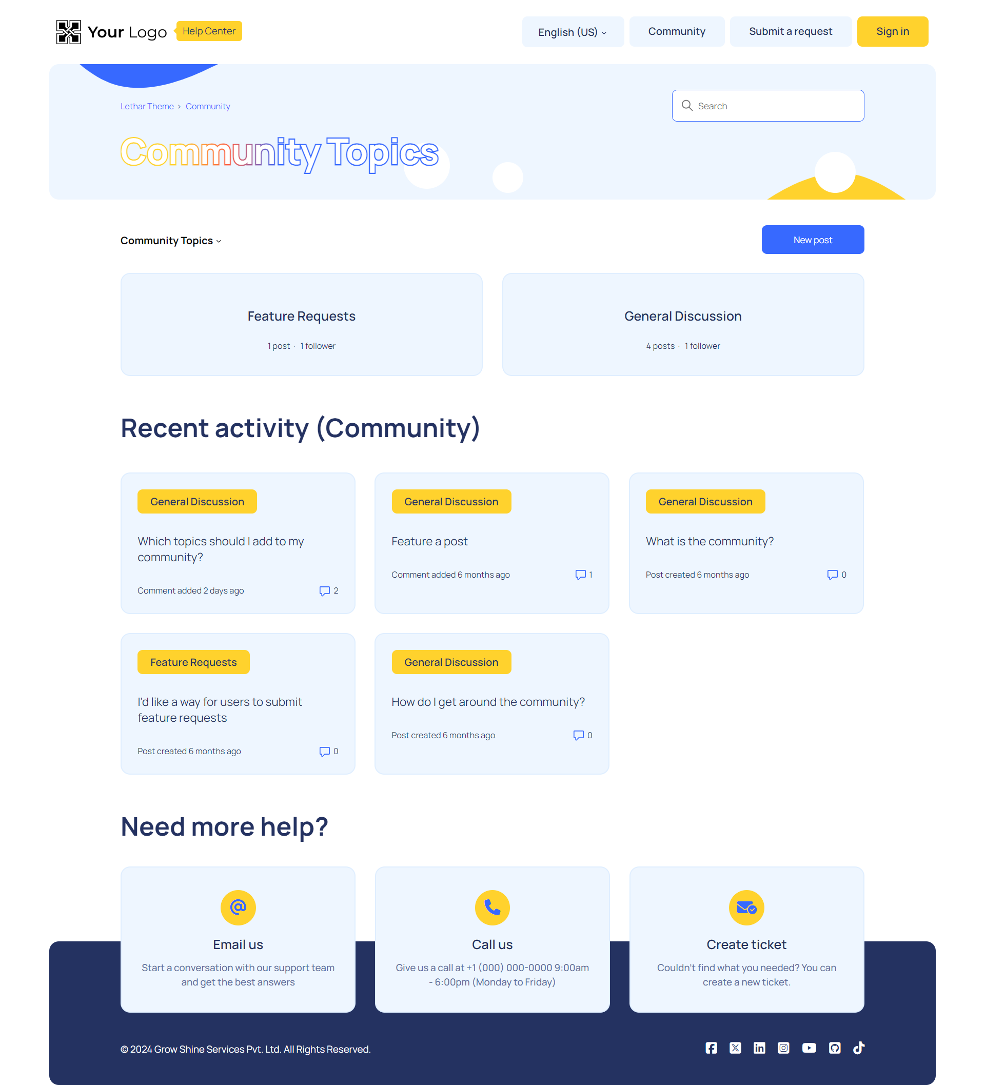 Lethar Zendesk Theme is power-packed with amazing page layouts, styles, and sidebar, apt for showcasing your support center to clients. Our pre-built options allow you to update many things, No coding is required. Built with Zendesk’s Templating API V4 and Generative answers (AI-search).