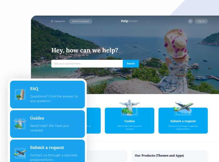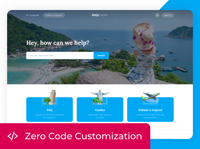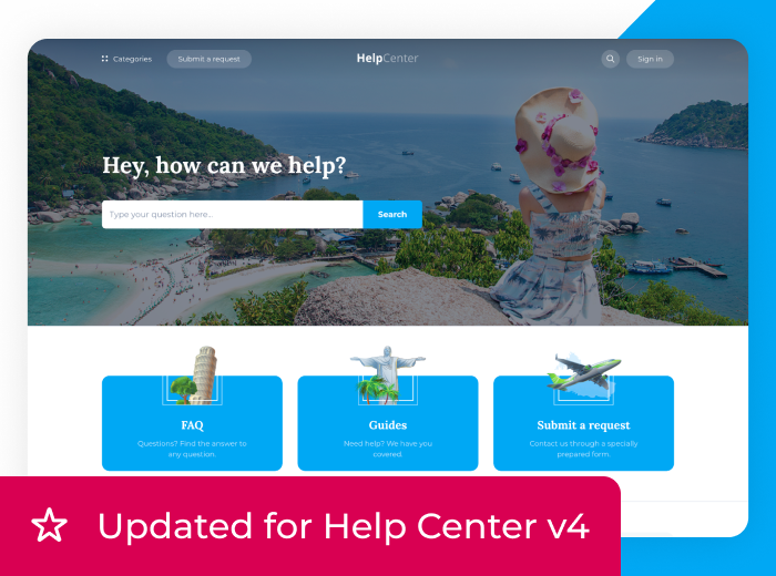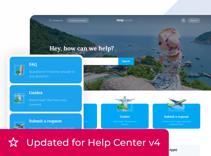 Capetown is a Zendesk theme that brings travel brands to life with playful style and vibrant, exotic visuals. Fully compatible with Help Center v4 and Generative Search. Responsive, easily customizable, and ready to showcase your unique brand identity.