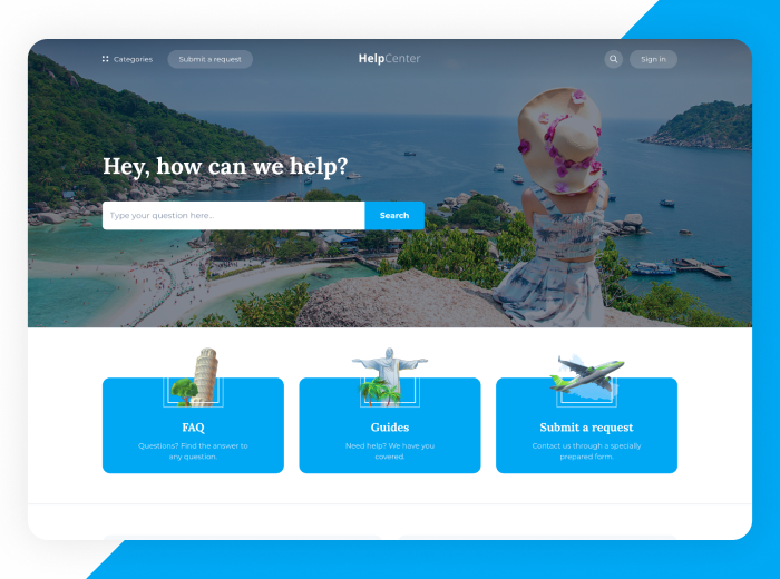 Experience wanderlust at first glance with the Capetown theme for the Zendesk Help Center. With playful charm and vibrant, exotic visuals, Capetown sets the scene for travel and adventure brands to truly shine.