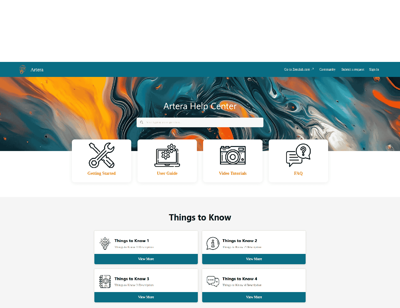 Page layoutsArtera uses a responsive layout for your Zendesk Help Center. With customizable homepage hero sections, a "Things to Know" content showcase (up to 10 cards), featured category blocks, a contact section with three options, and a flexible footer with multiple sections and social media integration, the theme makes it easy to organize content clearly. Whether on desktop or mobile, Artera provides a consistent, user-friendly experience.