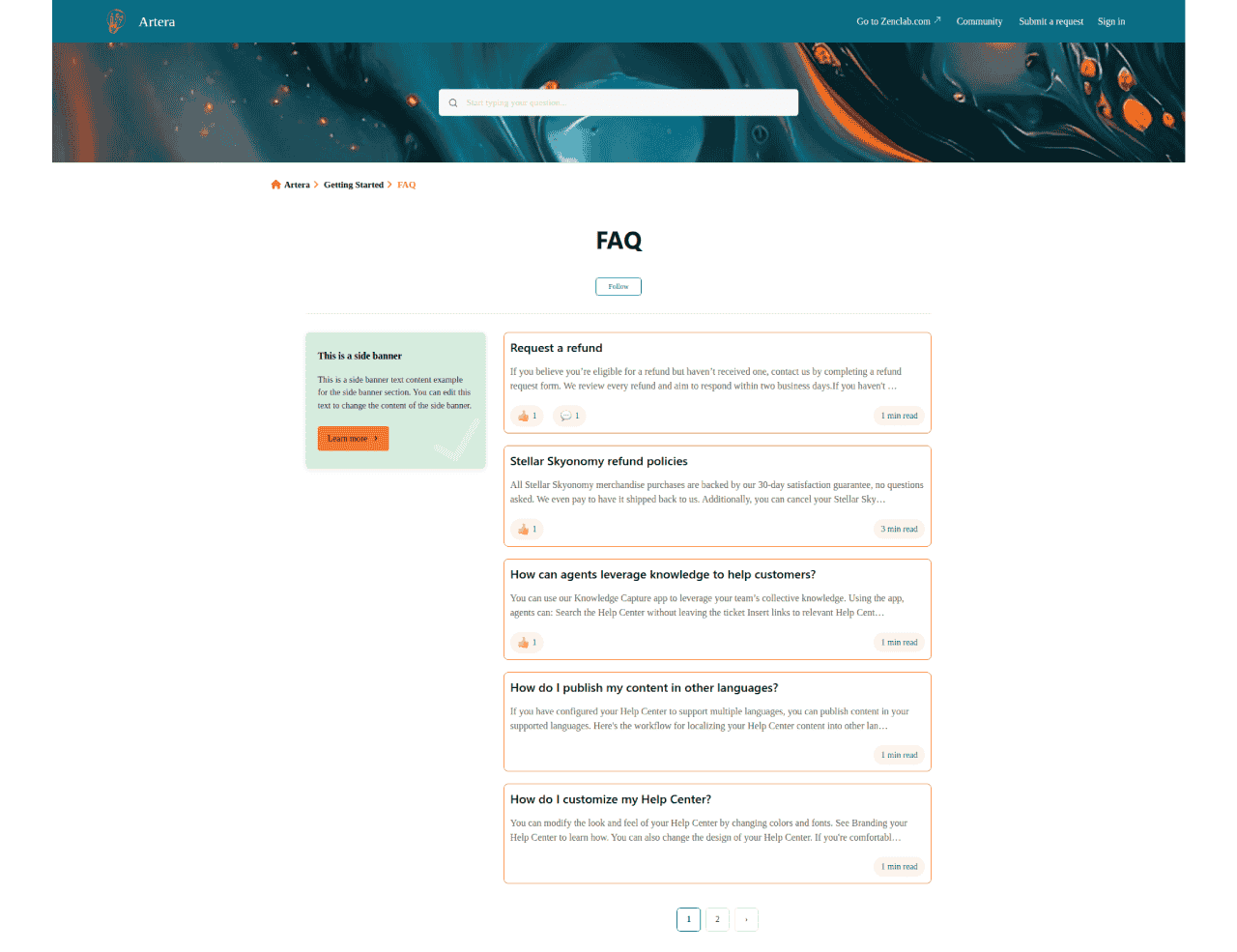 Easily customizableArtera balances simplicity and flexibility; no coding required. The settings panel lets you customize colors, fonts, hero images, homepage sections, footer content, and social links. With controls for brand colors, typography, images, and layout options, you can create a branded Help Center that reflects your identity--quickly and effortlessly.