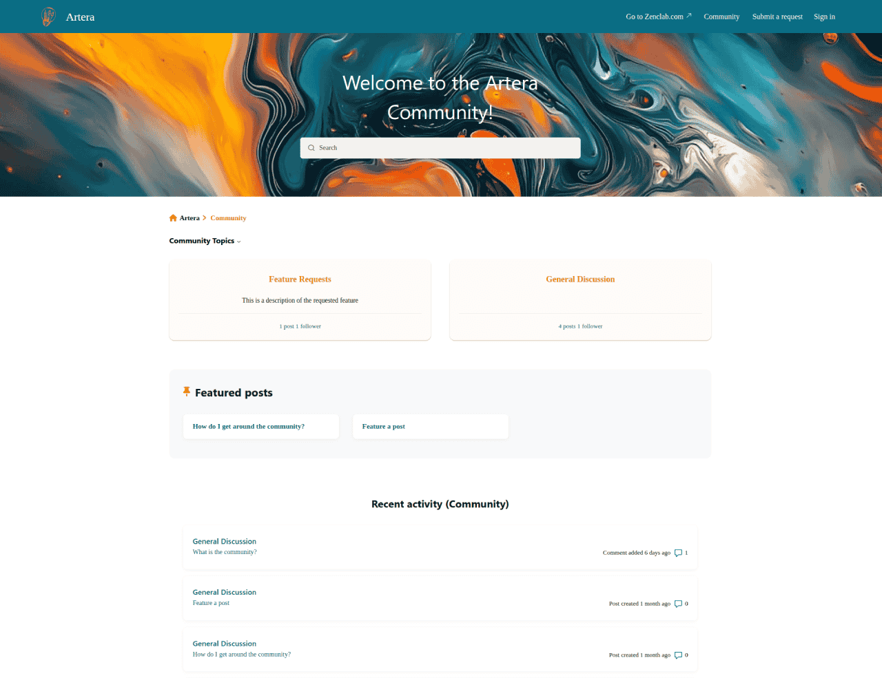 Need any help?Our support team is available to help install, set up, and customize Artera. Contact us at contact@zenclab.com with questions--we’re here to help you build a Help Center that connects with your audience.