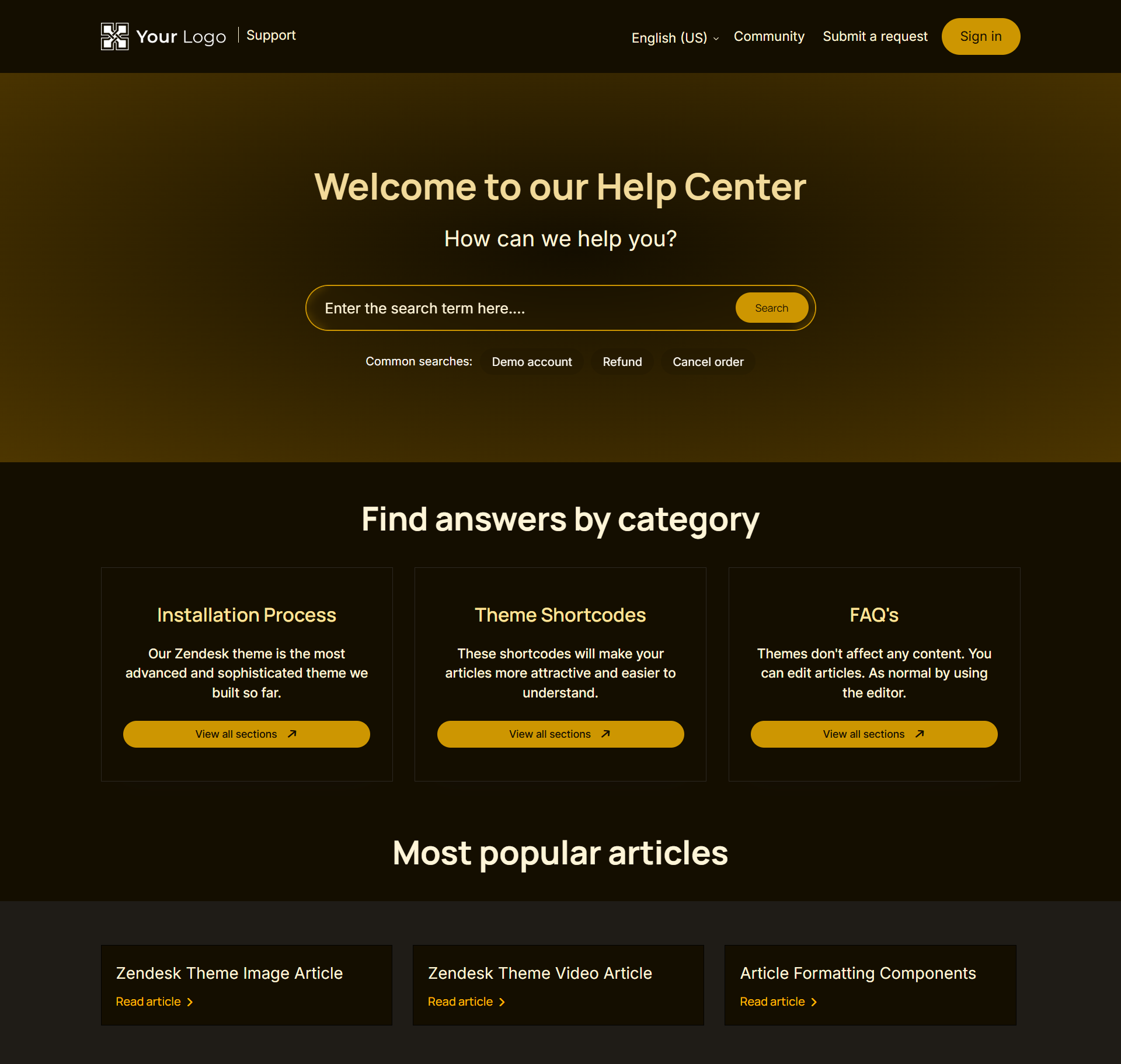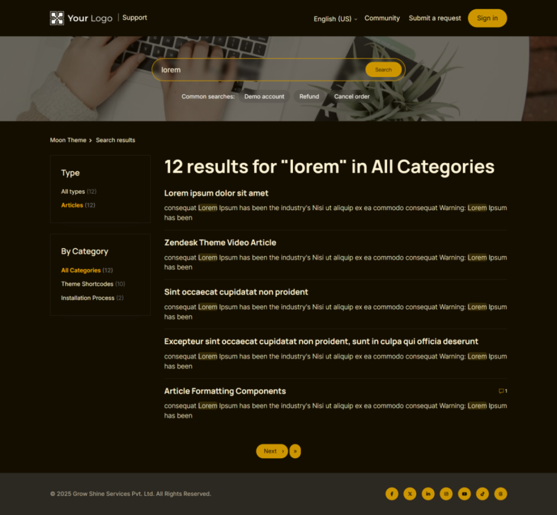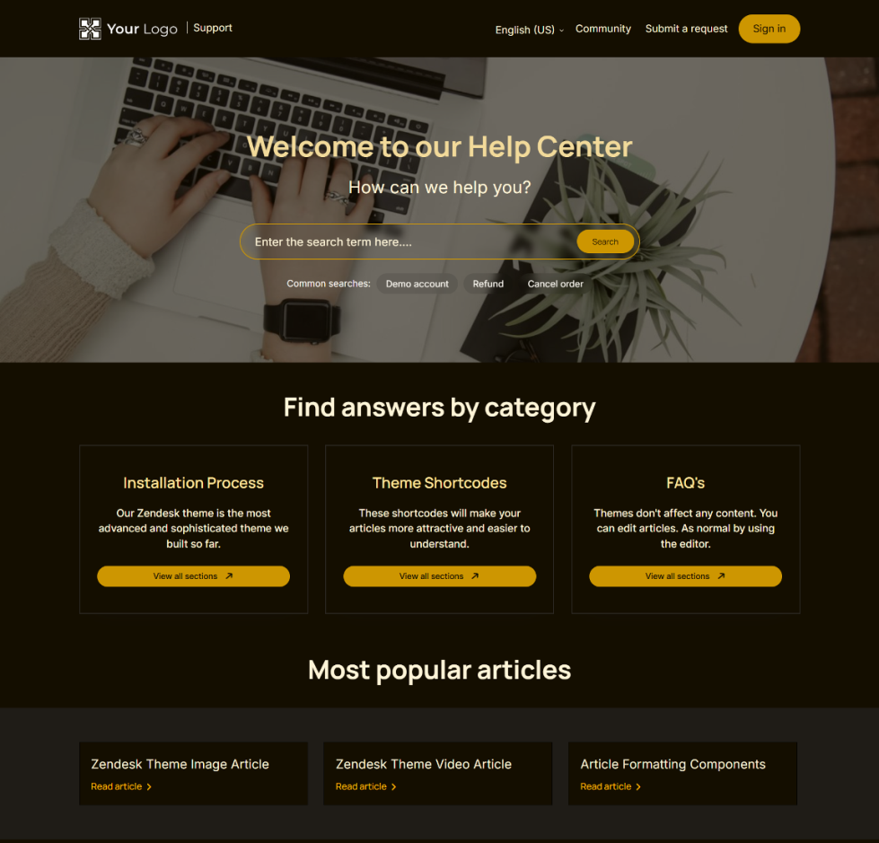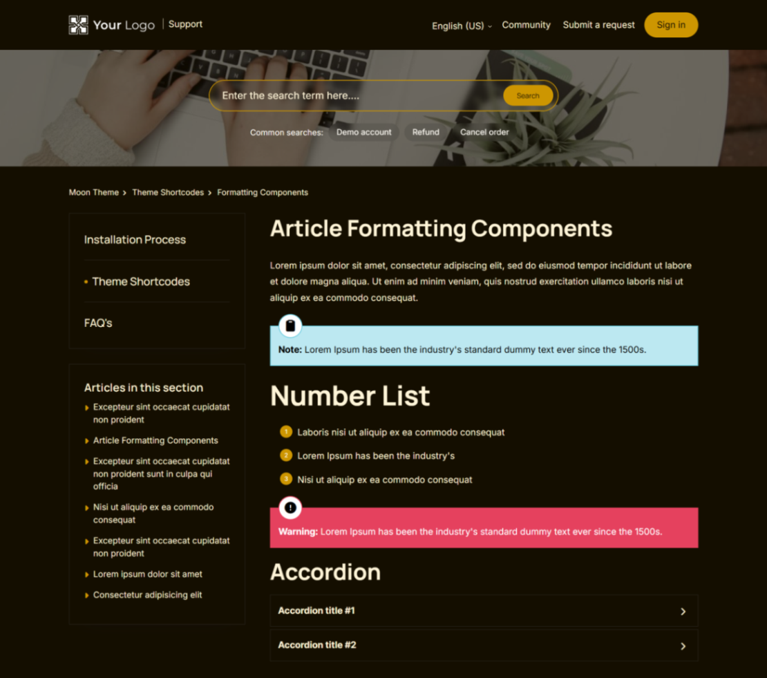 Moon is a dark styled and creative Help Center theme for all agencies that offers a creative impact. Built with Zendesk’s Latest API and AI-search.
