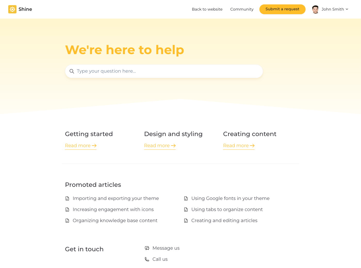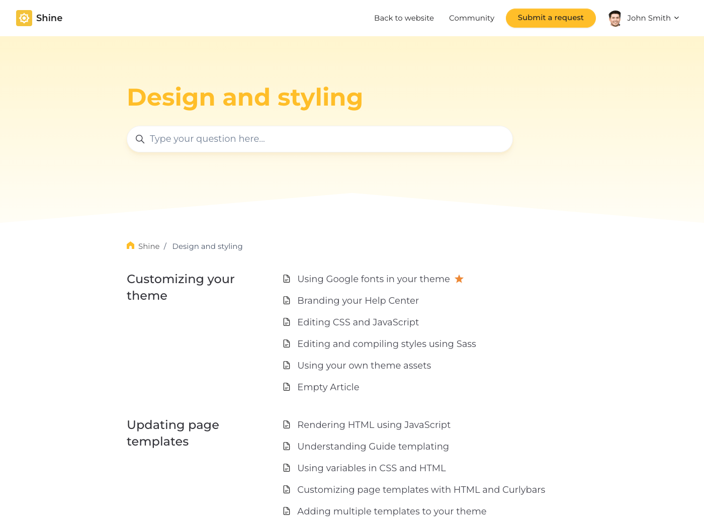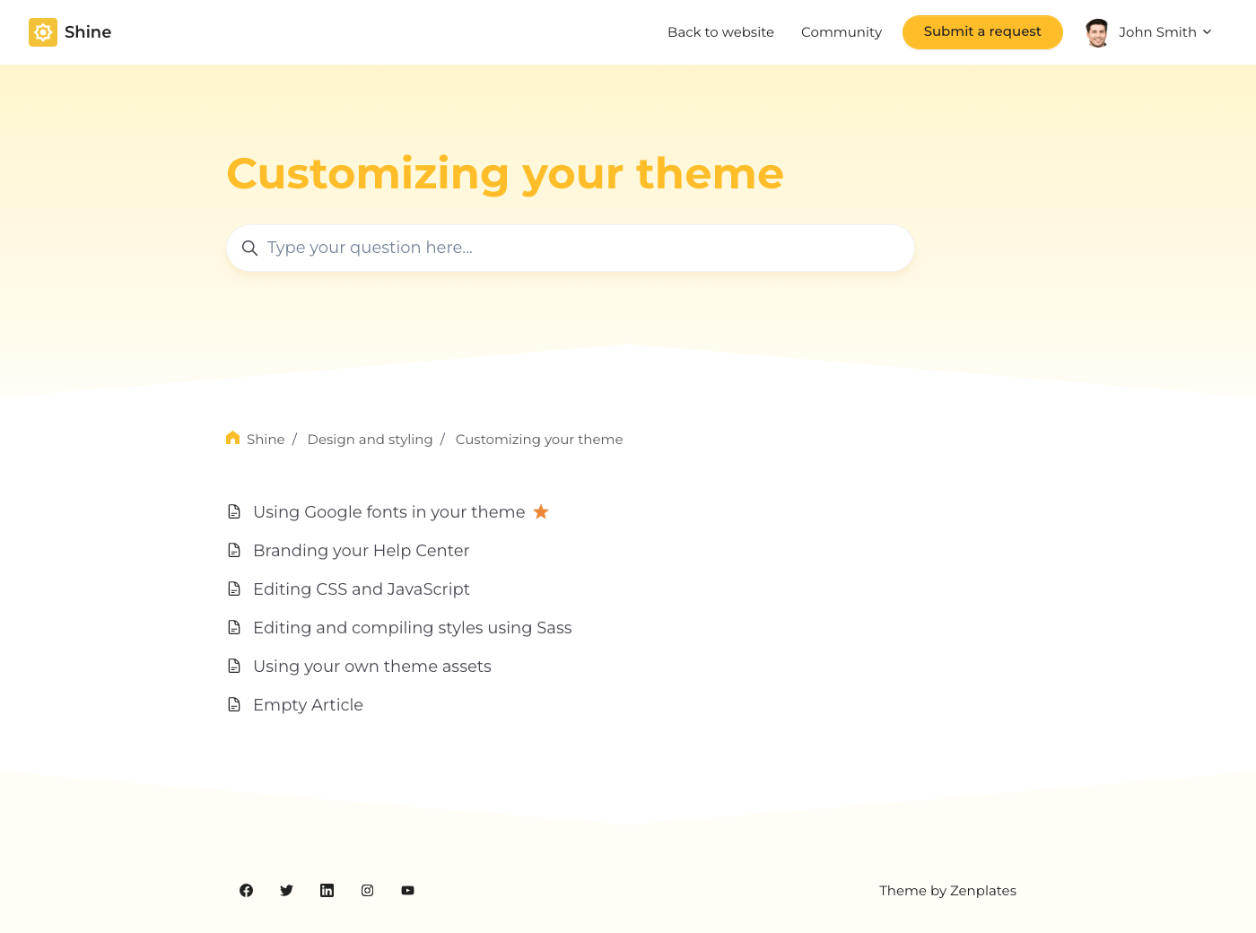 Shine is a beautiful and highly customizable theme for Zendesk Guide. It is designed to serve as a solid foundation on which to build an amazing knowledge base for your customers.