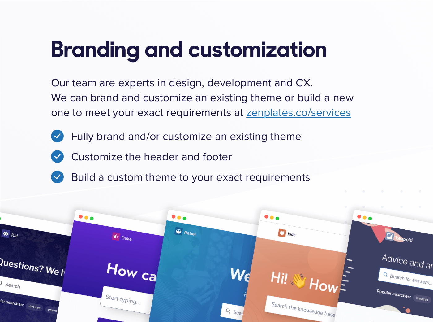 We also design and build custom Zendesk themes and apps and have partnered with hundreds of companies to bring their help center visions to life. If you’re looking for a professionally developed custom theme along with expert advice and guidance around UX best practices, we’d love to hear from you.
