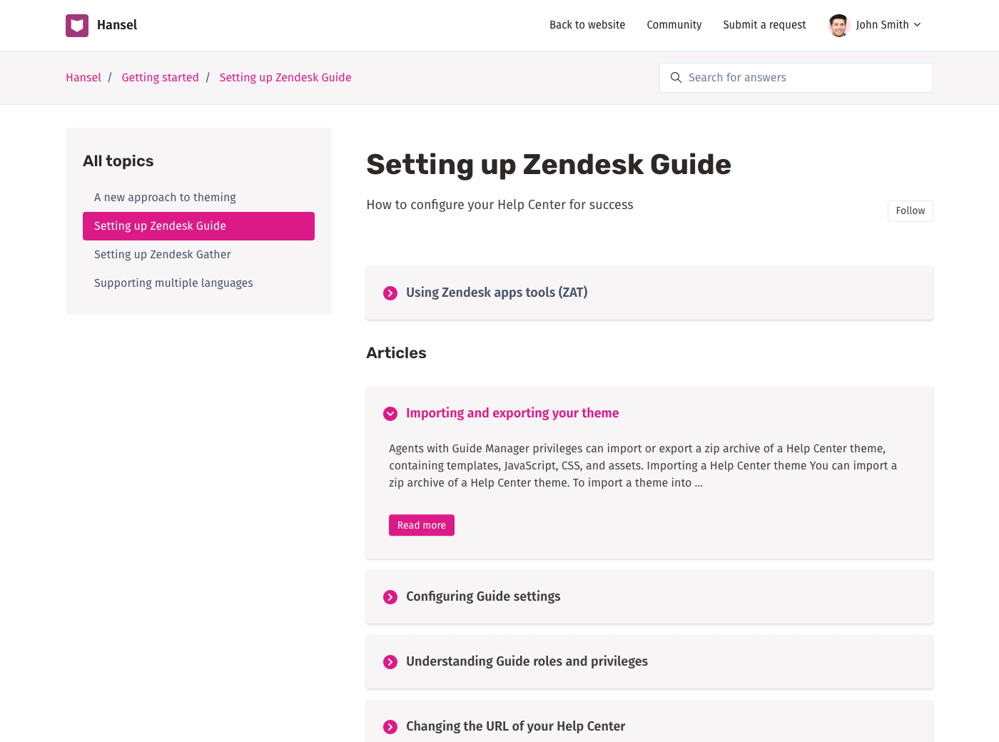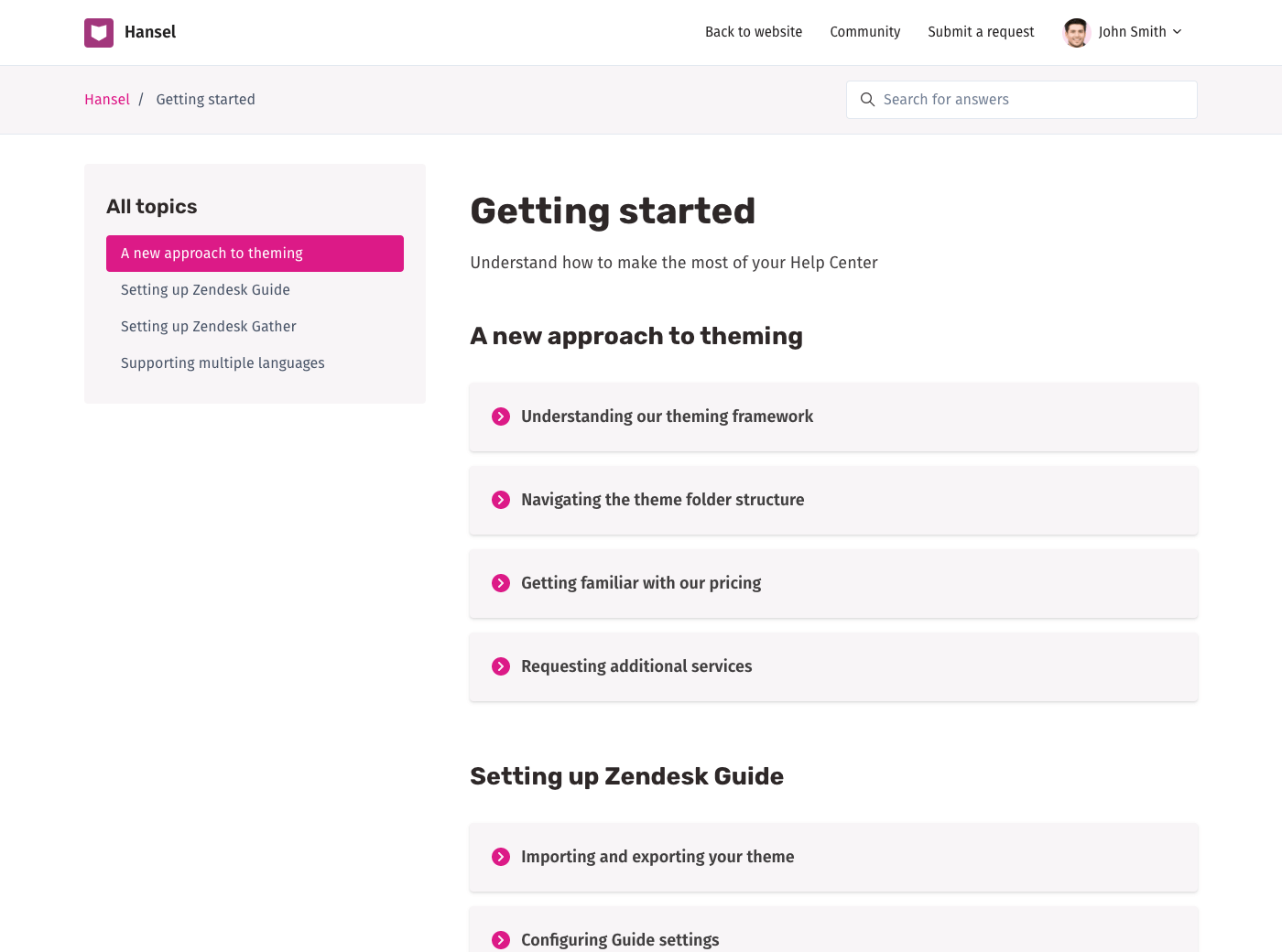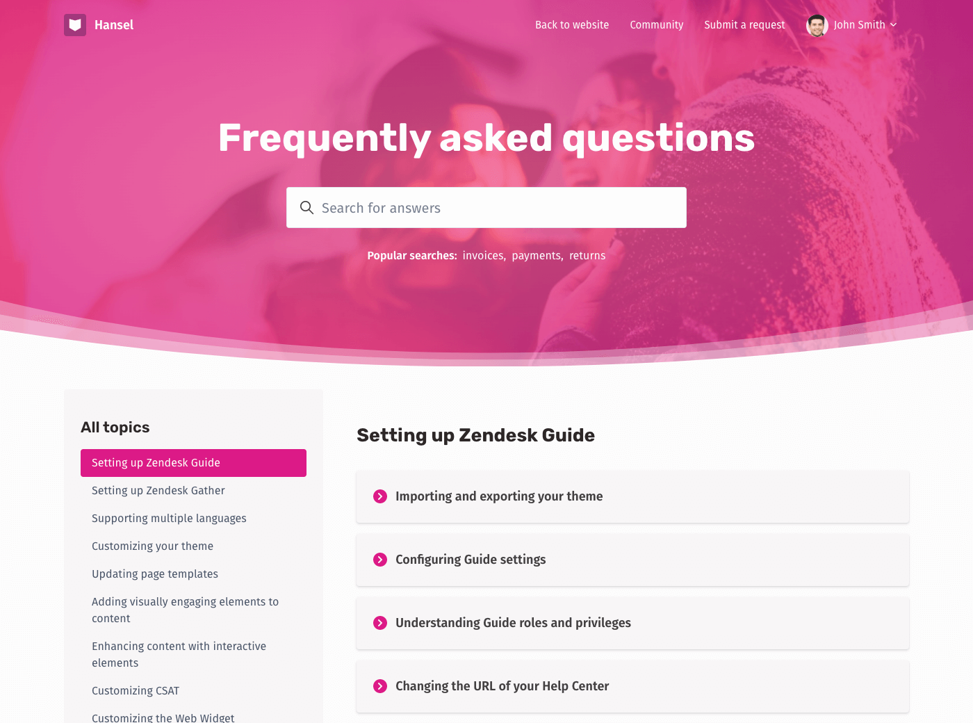 Hansel is a beautiful and highly customizable theme for Zendesk Guide. It is designed to serve as a solid foundation on which to build an amazing knowledge base for your customers.