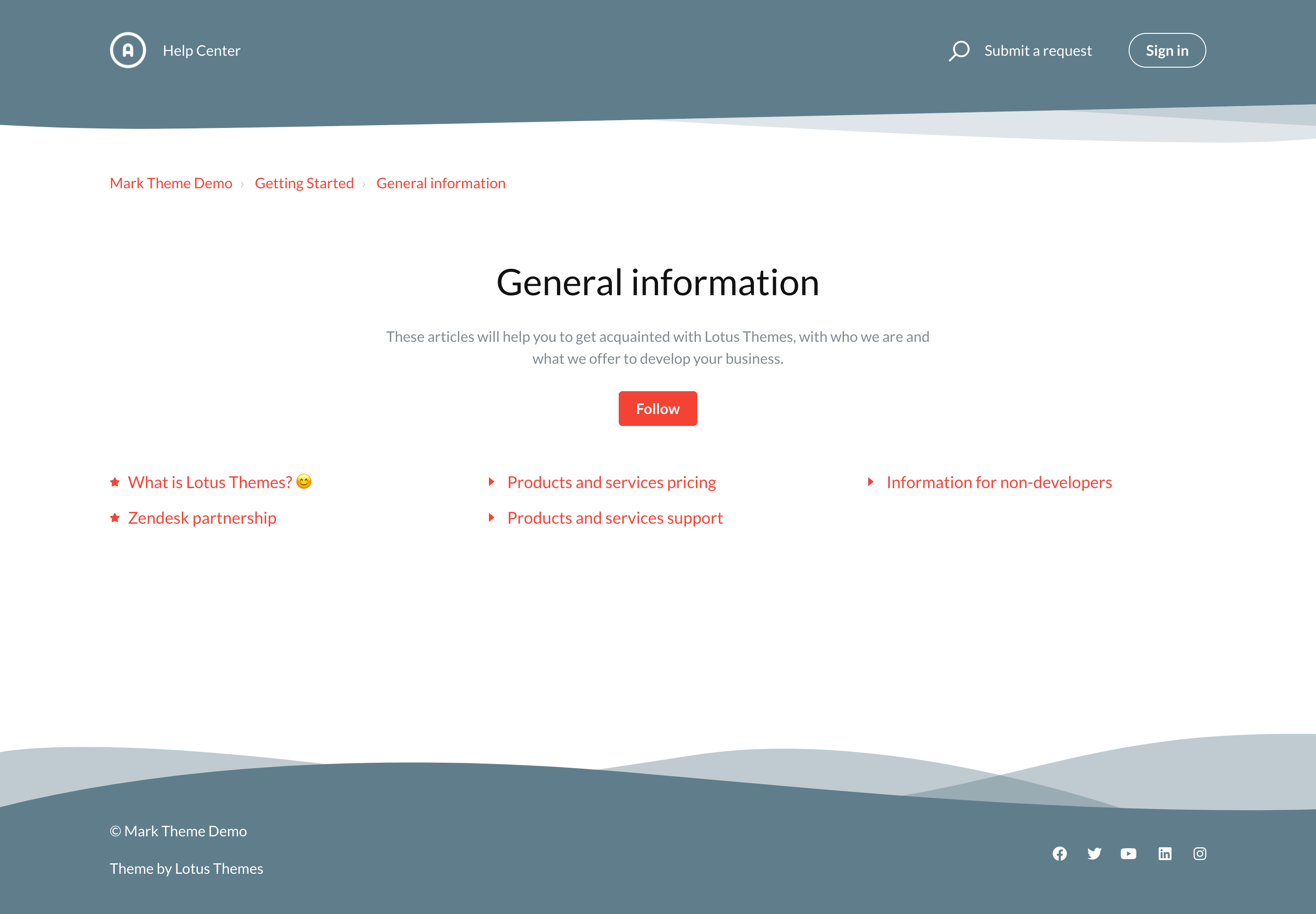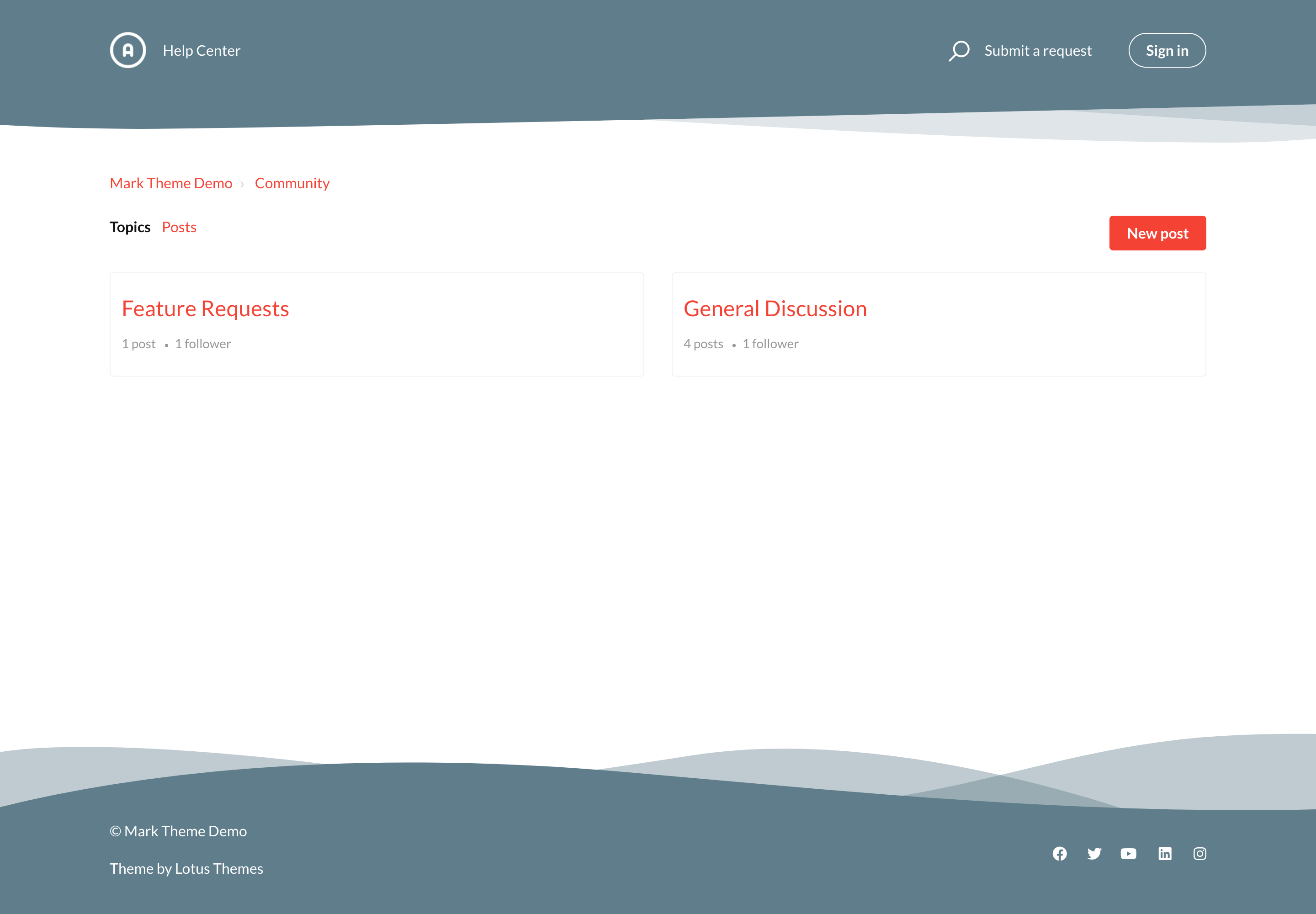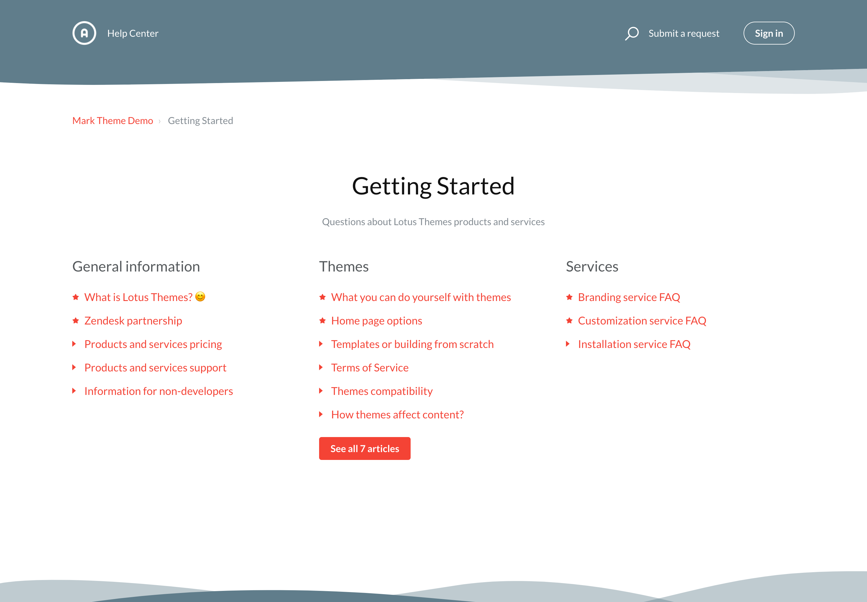 Mark is an ultra-modern Zendesk theme with a wave pattern and minimalist design. The homepage features a non-standard layout with custom blocks that overlap the hero unit.
