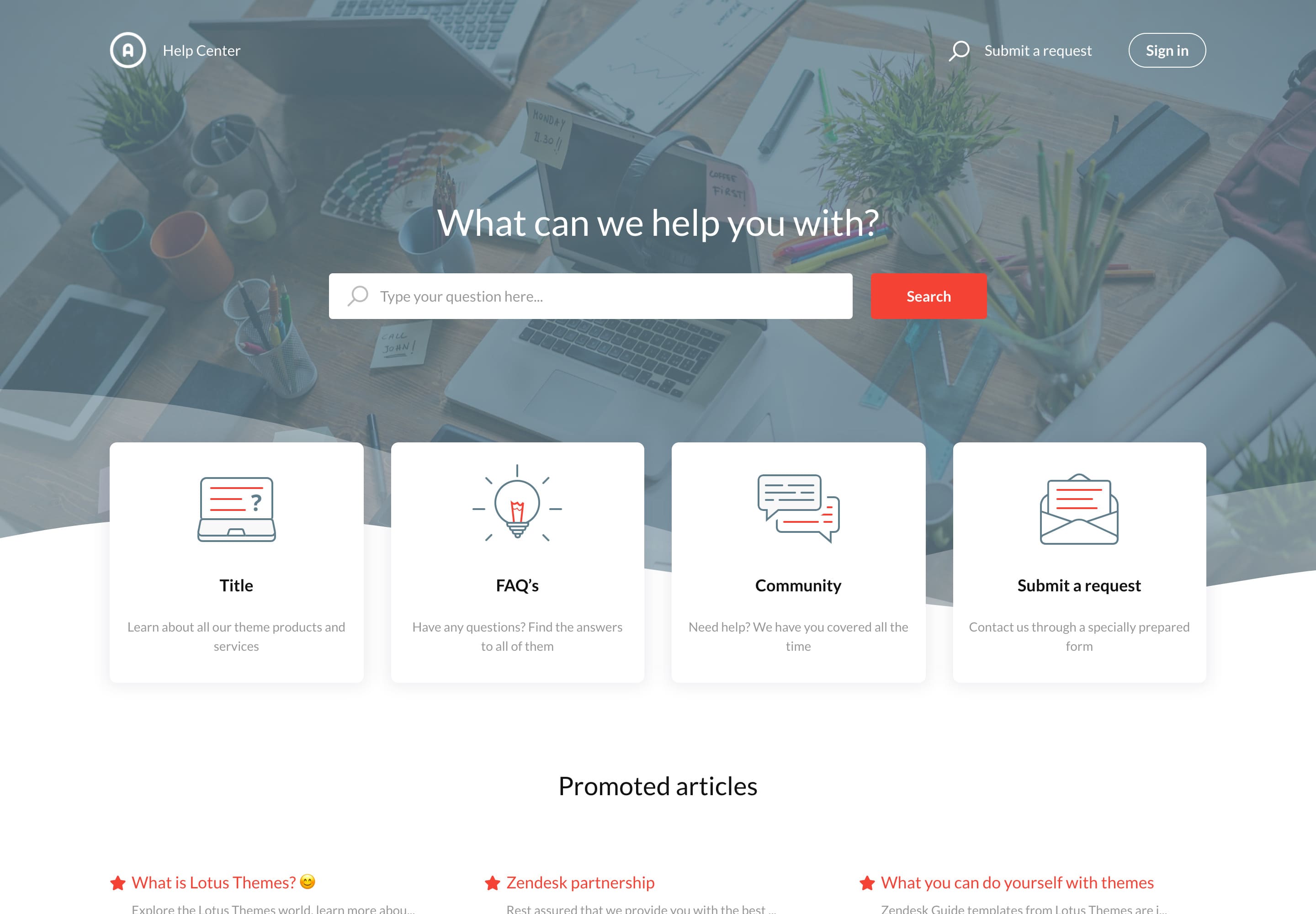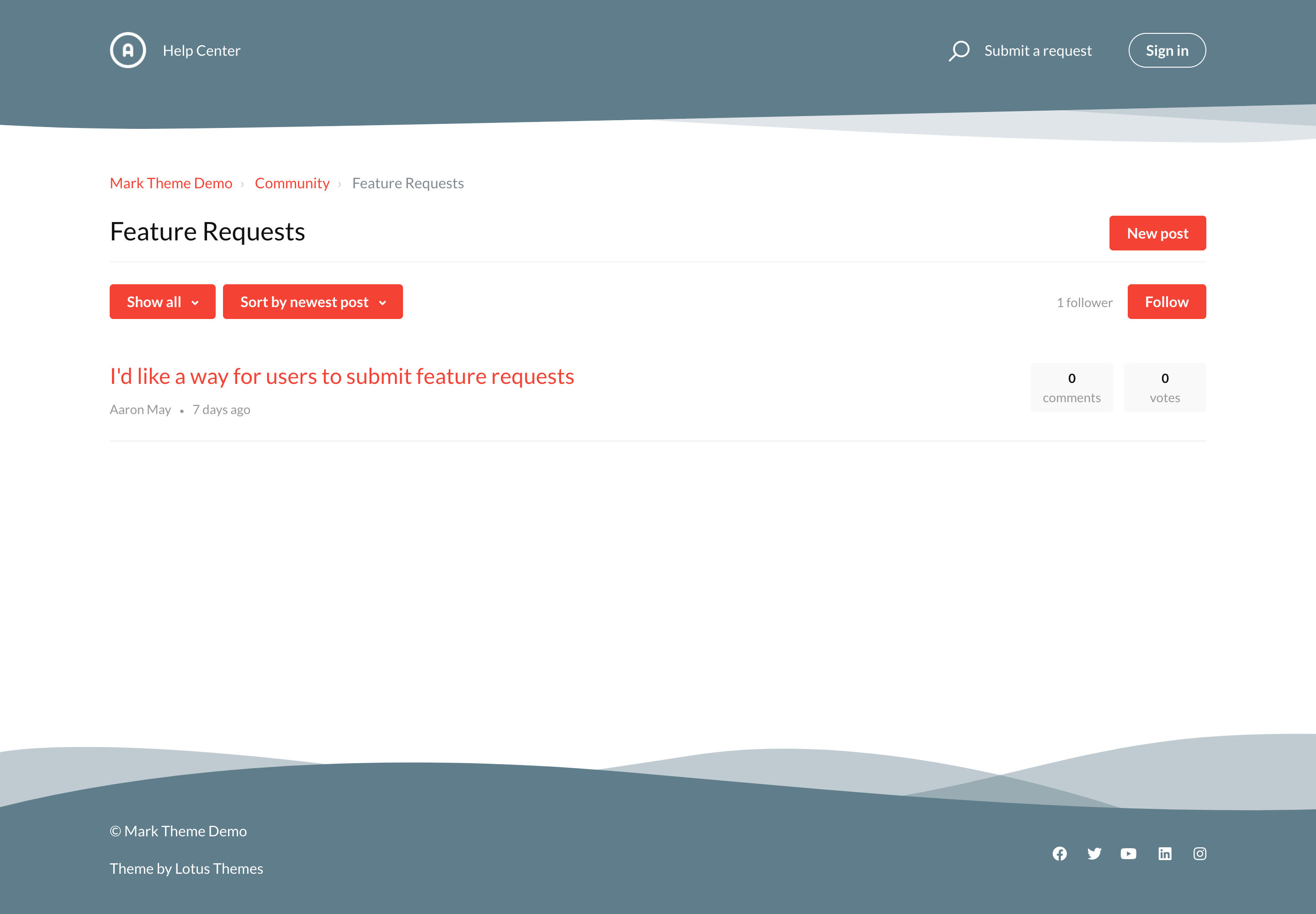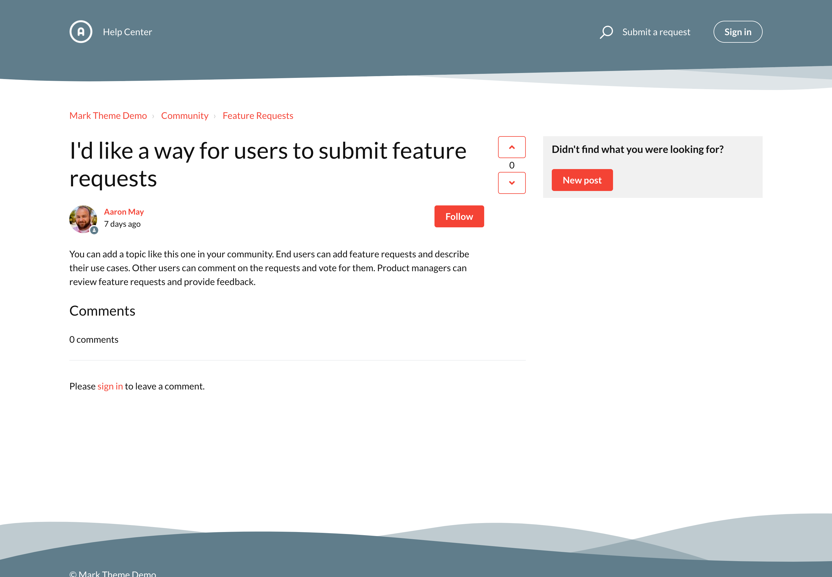 Mark is an ultra-modern Zendesk theme with a wave pattern and minimalist design. The homepage features a non-standard layout with custom blocks that overlap the hero unit.